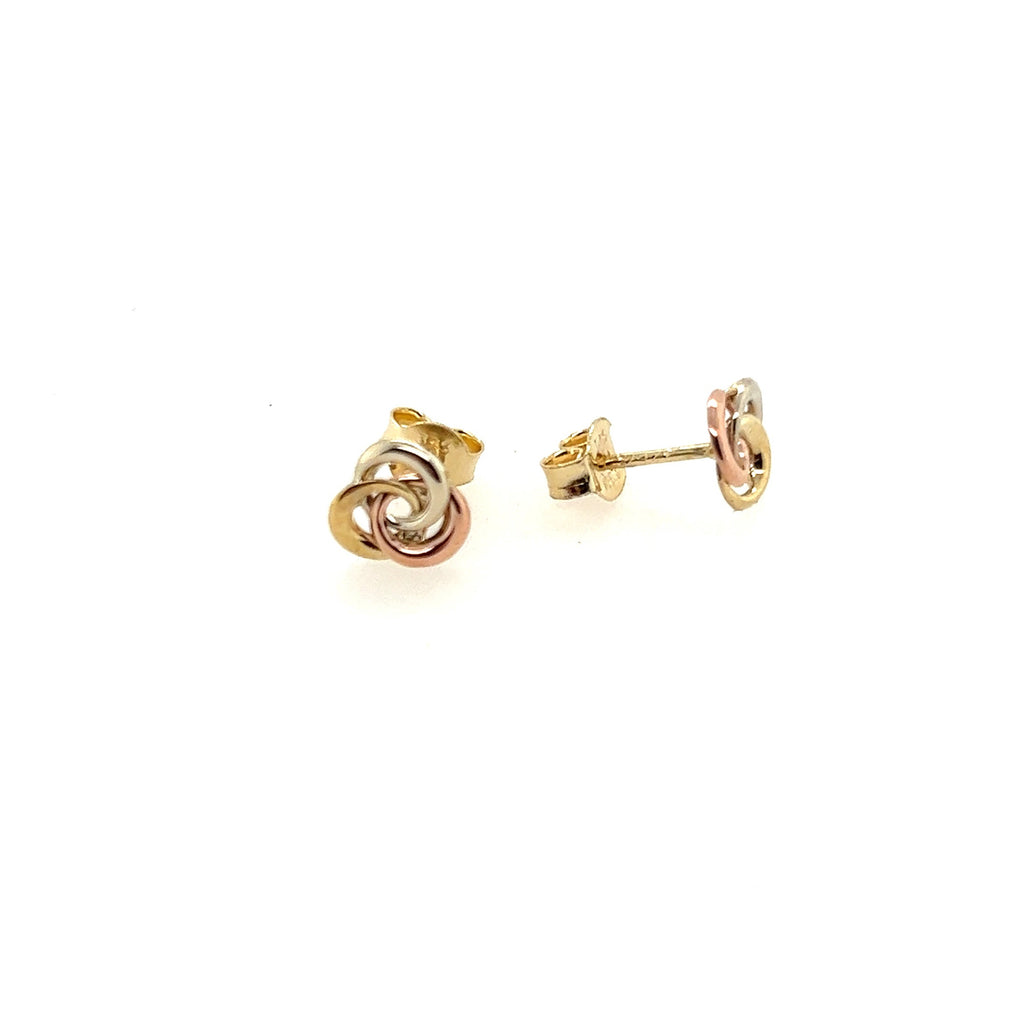 Classic trilogy interlinked 9 carat yellow, white and rose gold stud earrings.