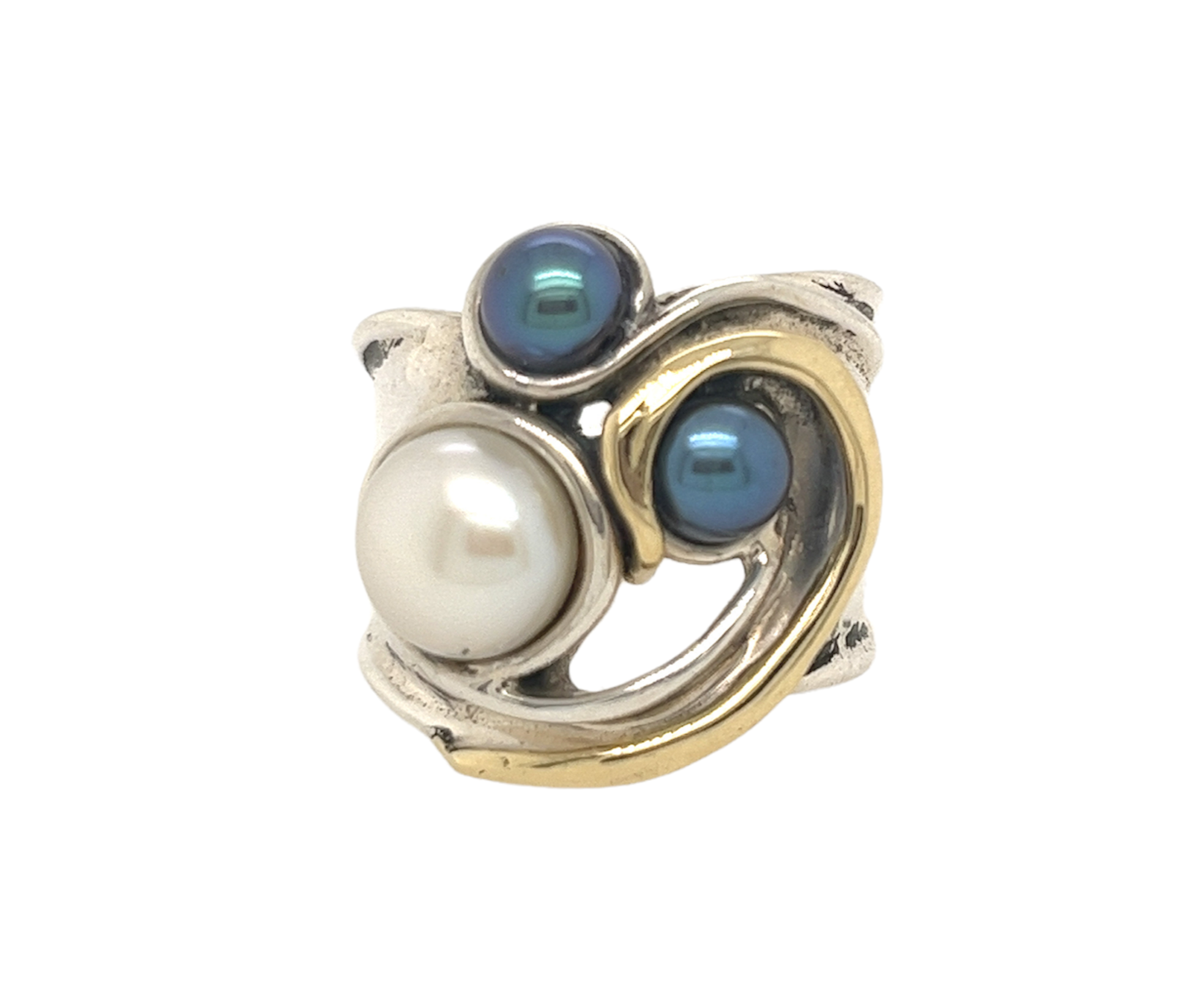 Wide band silver ring, with three fresh water pearls, peacock and white and 9 carat gold detailing. A beautiful Hagit Designs ring.