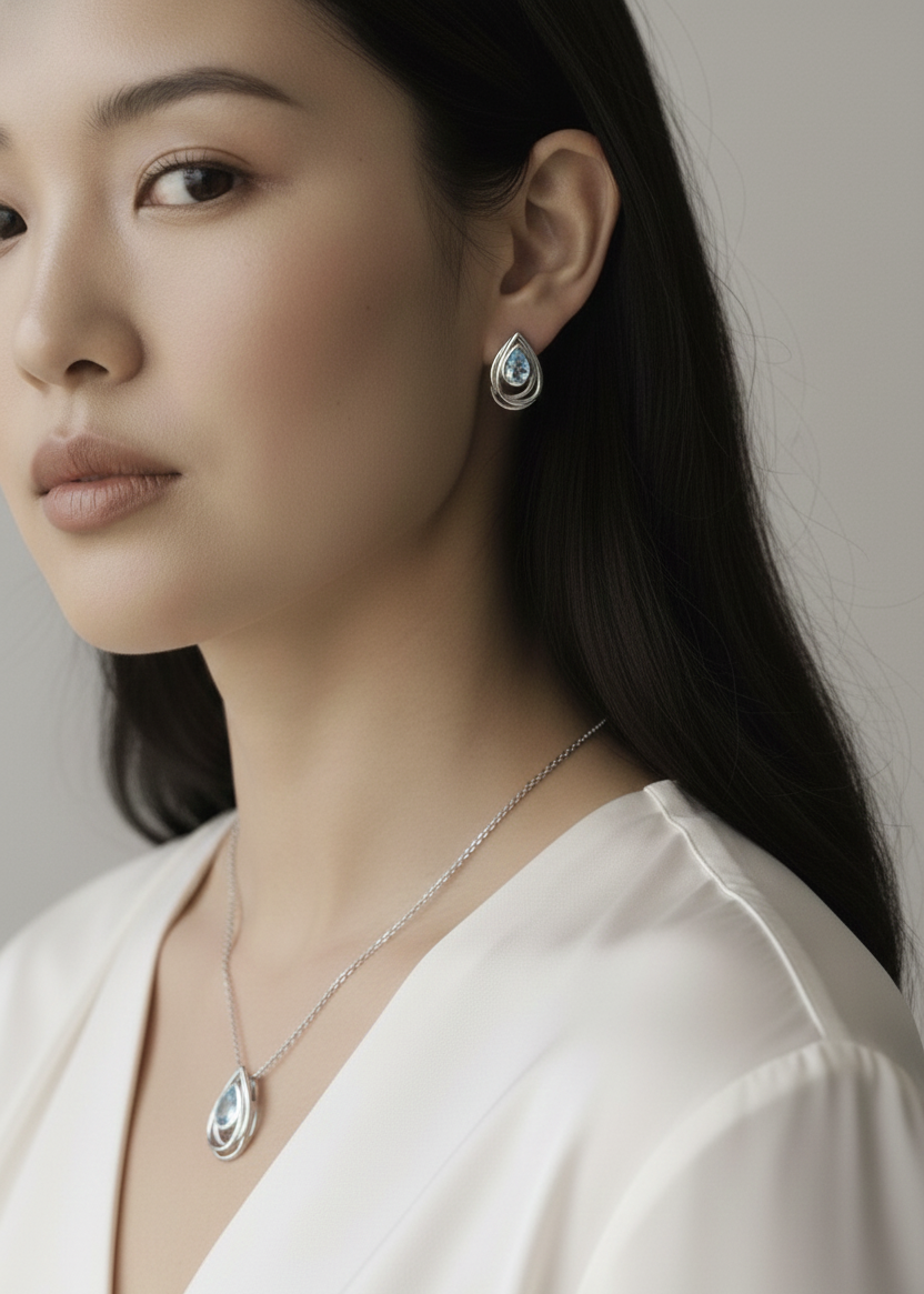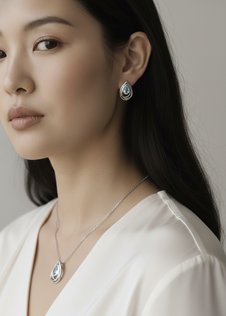 Teardrop Blue Topaz stud earrings with organic silver, wrap around setting.