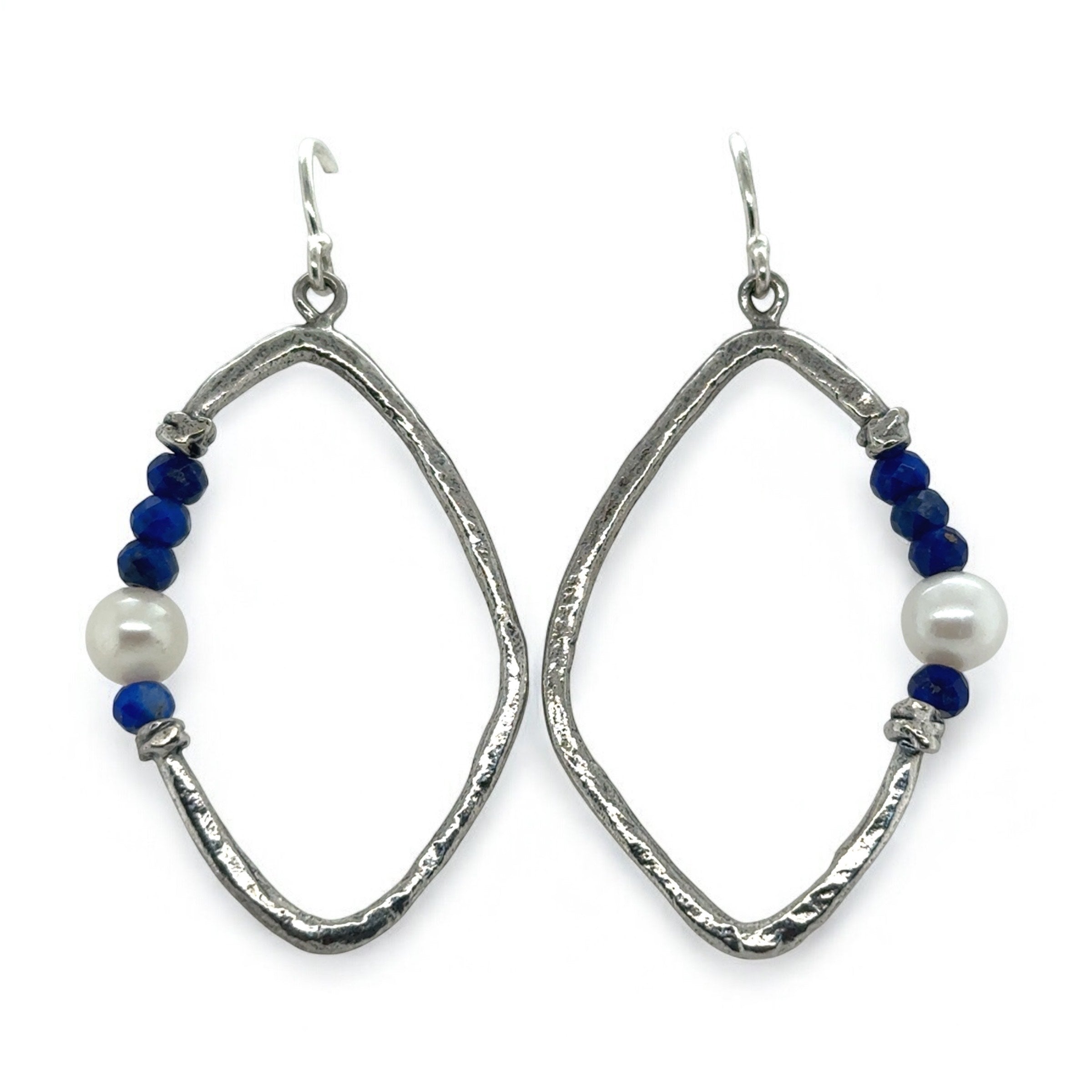 Organic silver partially beaded drop earrings featuring lapis and fresh water pearls. Part of the Saphirim collection.