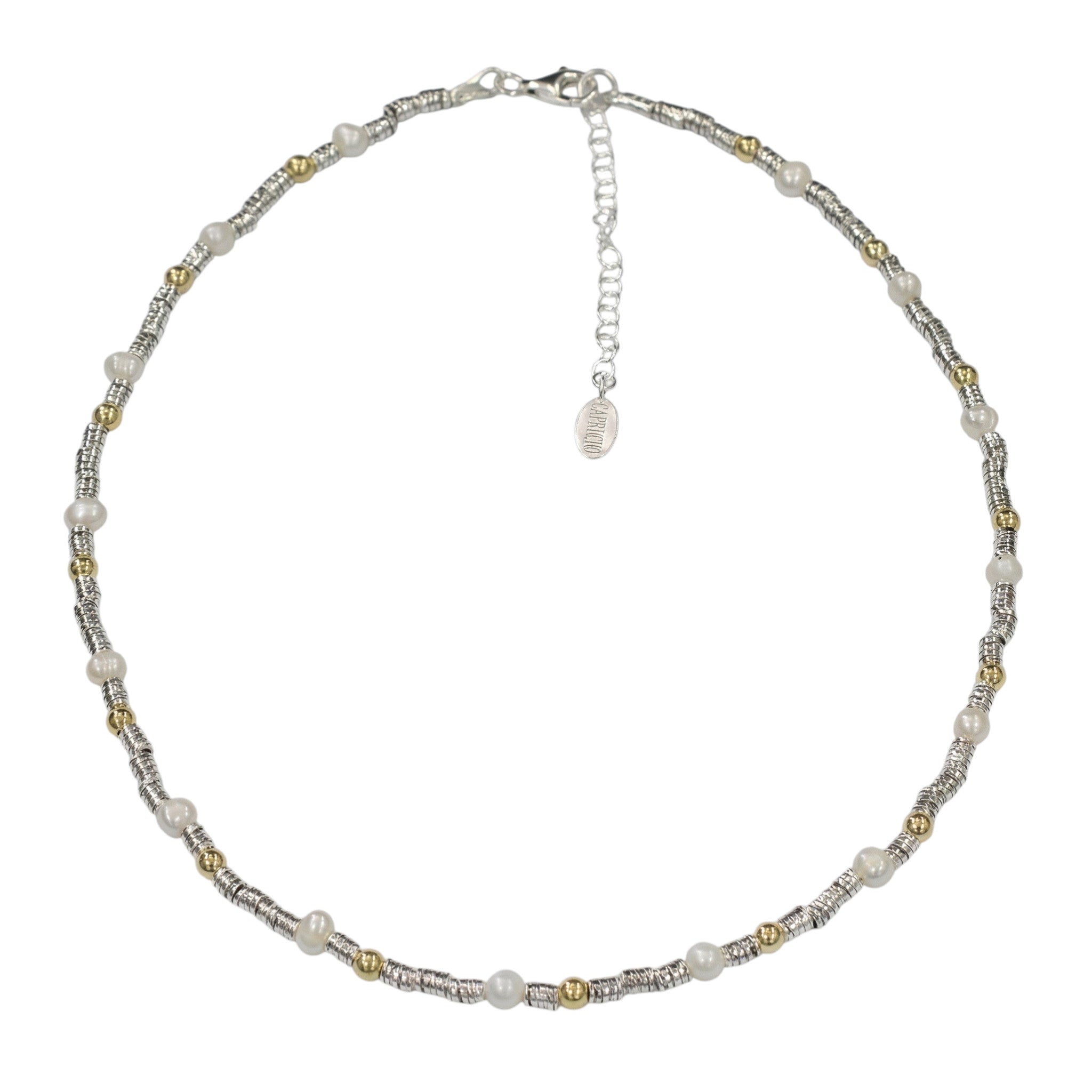 Silver and gold plated bead and fresh water pearl necklace. Part of the Saphirim collection.