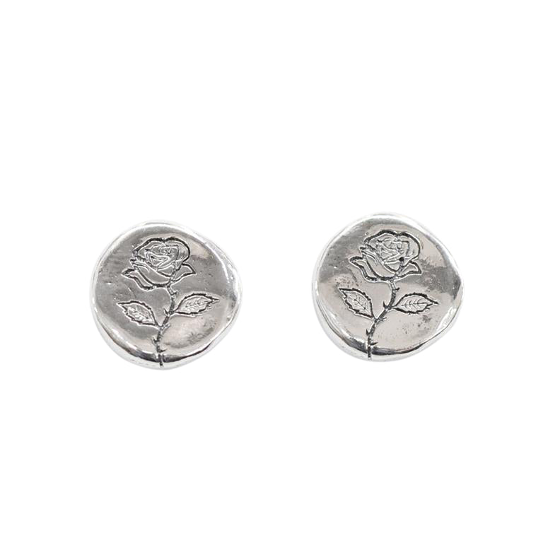 Organic round birth month flower stud earrings with an oxidised silver finish. Rose flower for the month of June. Part of the Saphirim collection.