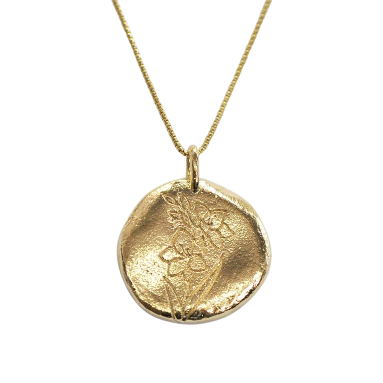 Organic round birth month flower pendant necklace, on a round filed box chain. Gladiolus flower for the month of August. Part of the Saphirim collection.