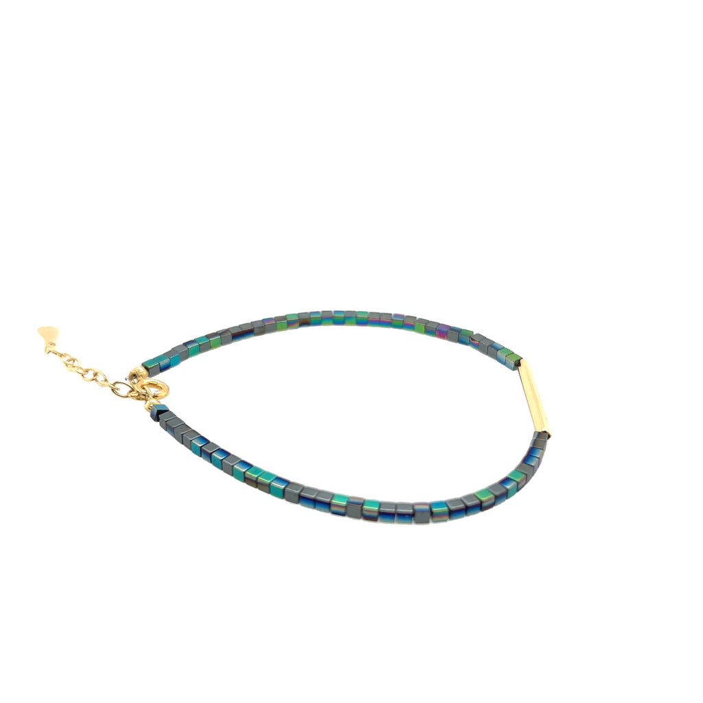 Multi hematite bead bracelet with a gold plated bar detail.