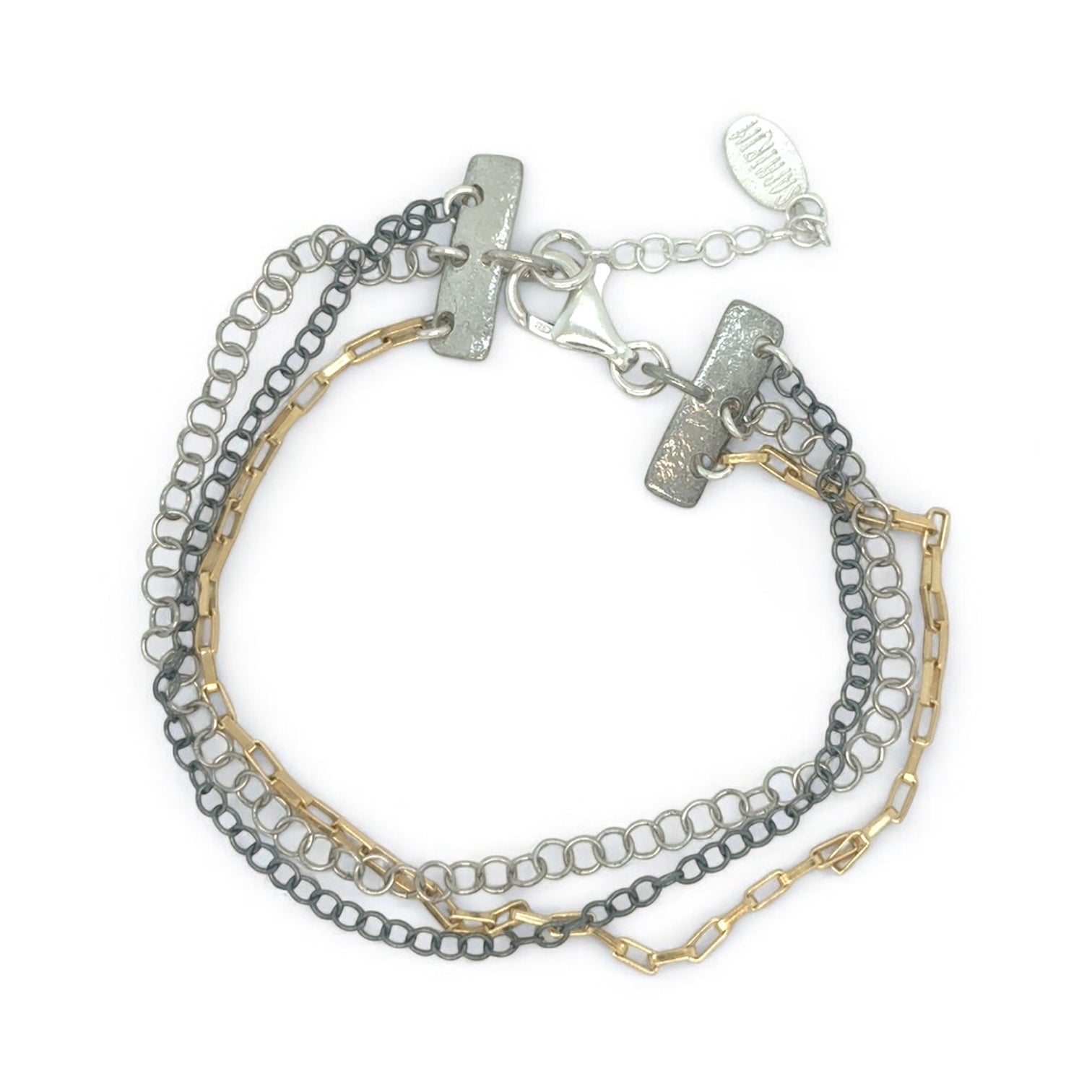 Multi chain bracelet with three colour finish and large chunky lobster clasp. Part of the Saphirim collection.