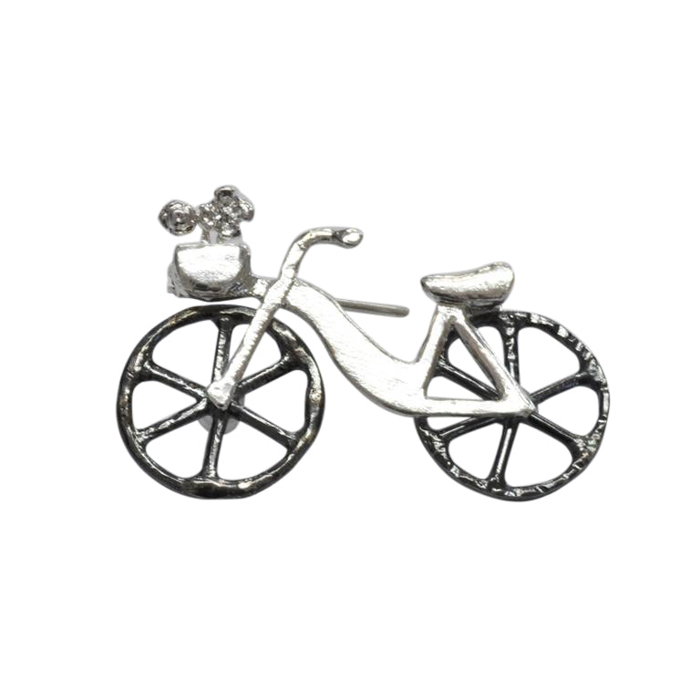Novelty two tone bicycle brooch with moving oxidised silver wheels. Part of the Saphirim collection.