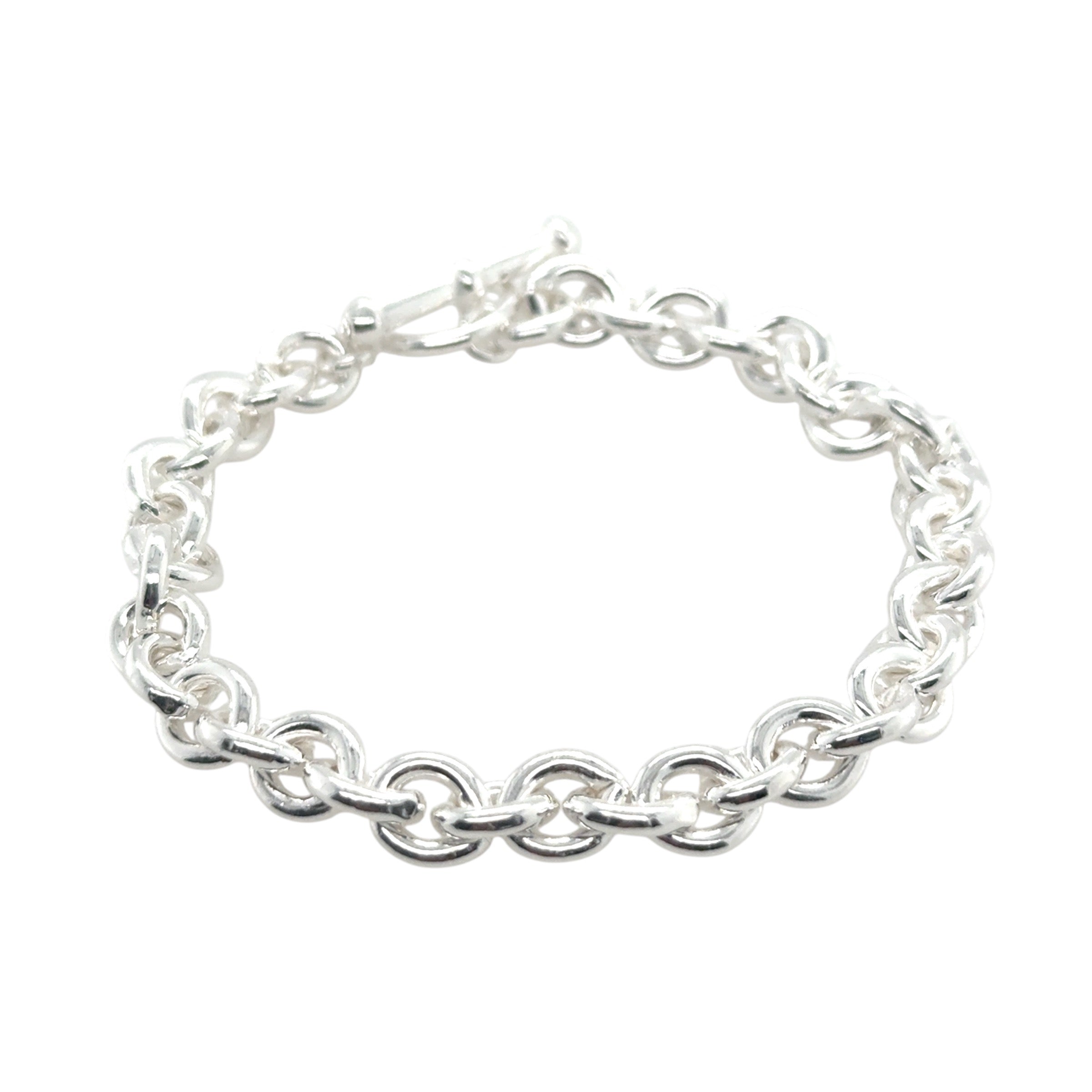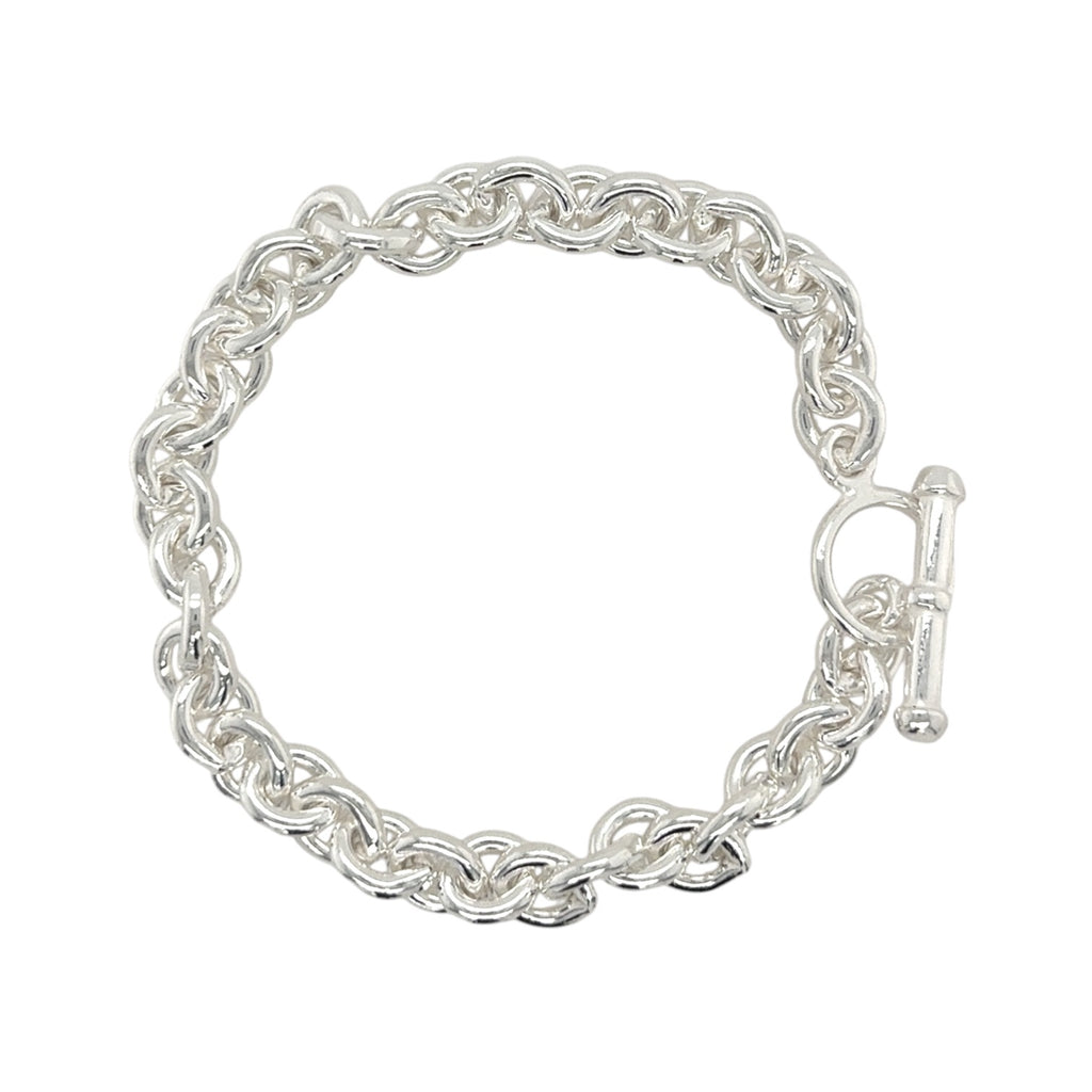 Round chain silver bracelet with t-bar clasp.