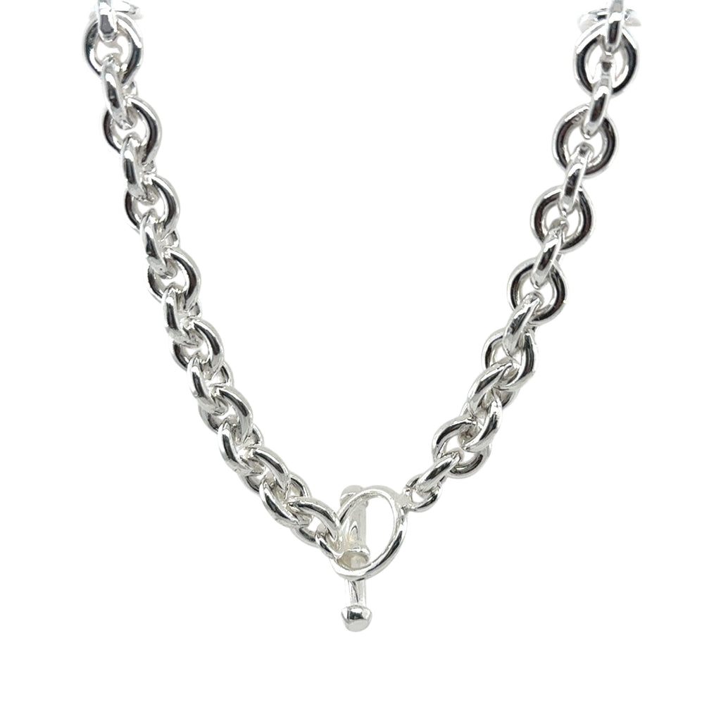 Round chain silver necklace with t-bar clasp.