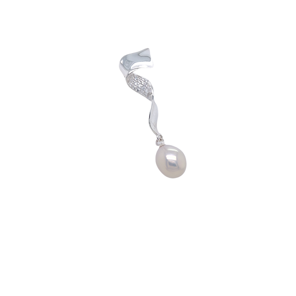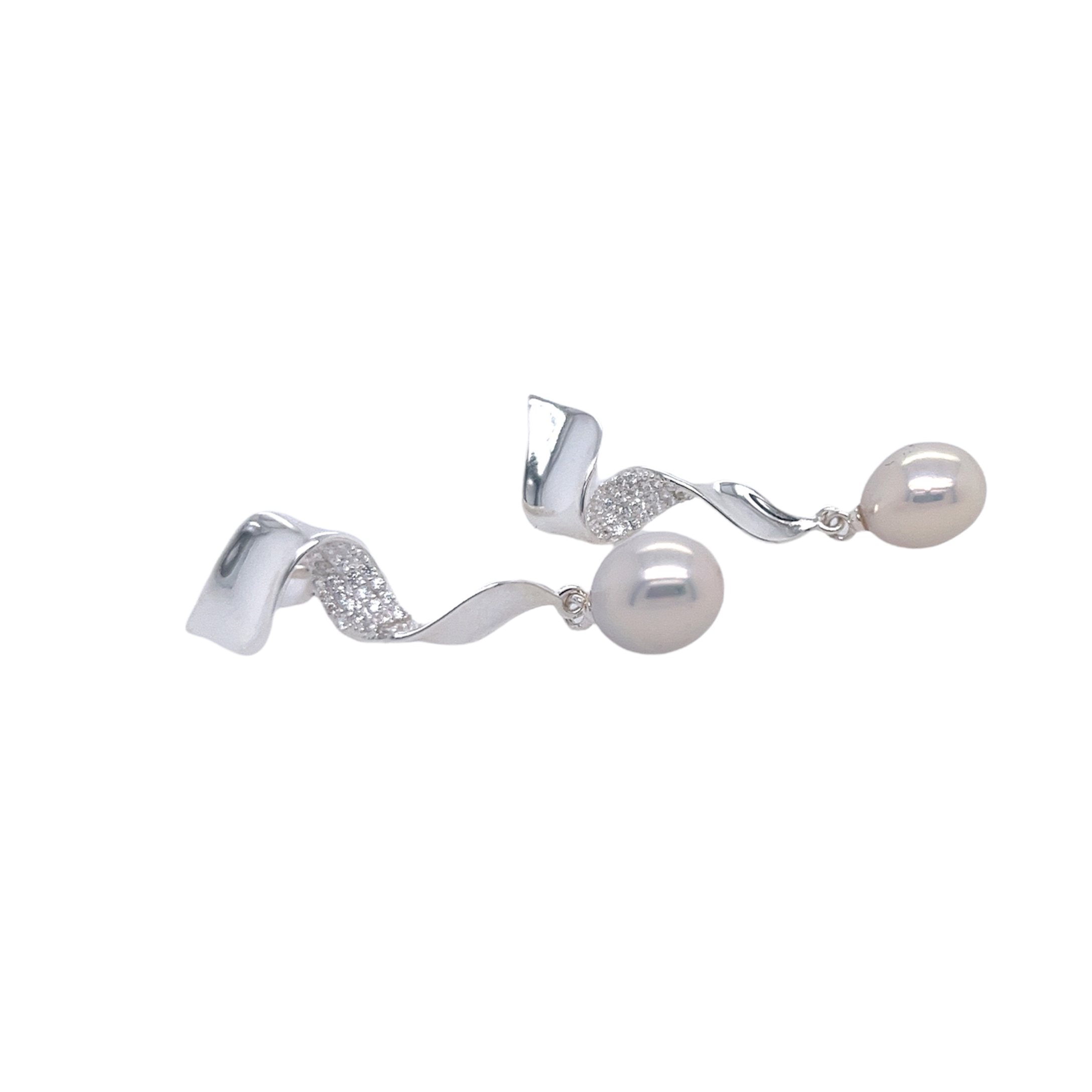 Twisted silver drop earrings with CZ detail and a freshwater white pearl.