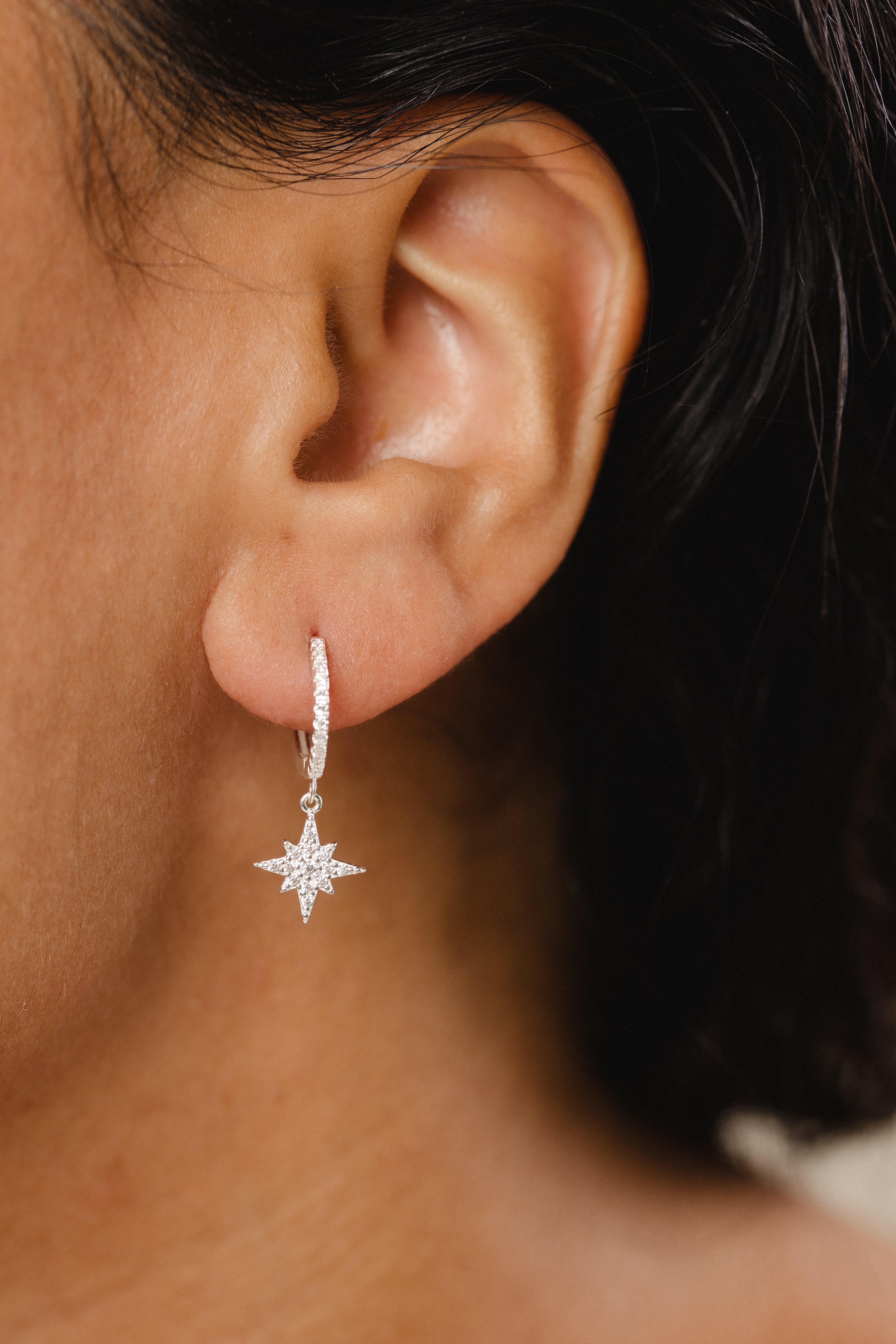 Silver star huggie earring, featuring a CZ star charm. This product comes as a pair.