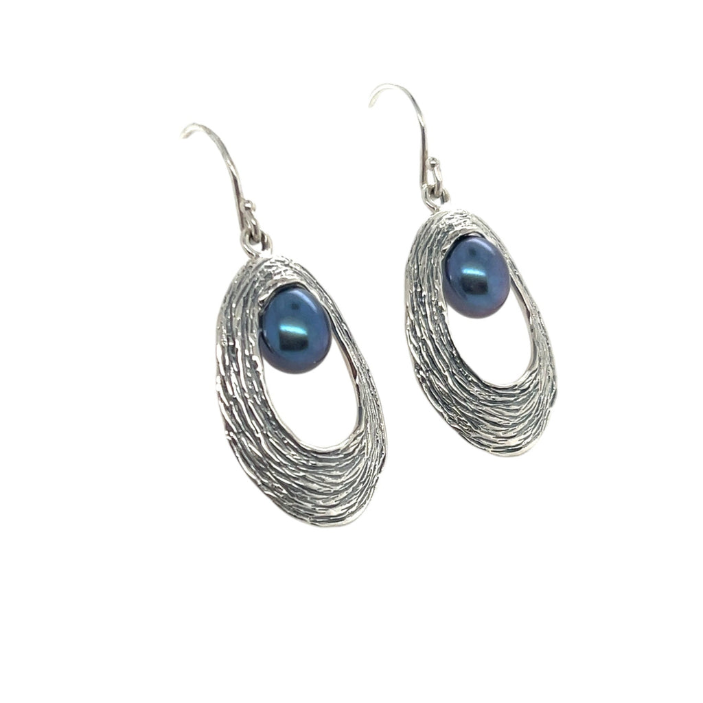 Organic, oval open design drop earrings with a peacock fresh water pearl and a textured, oxidised finish. Part of the Hagit Designs collection.