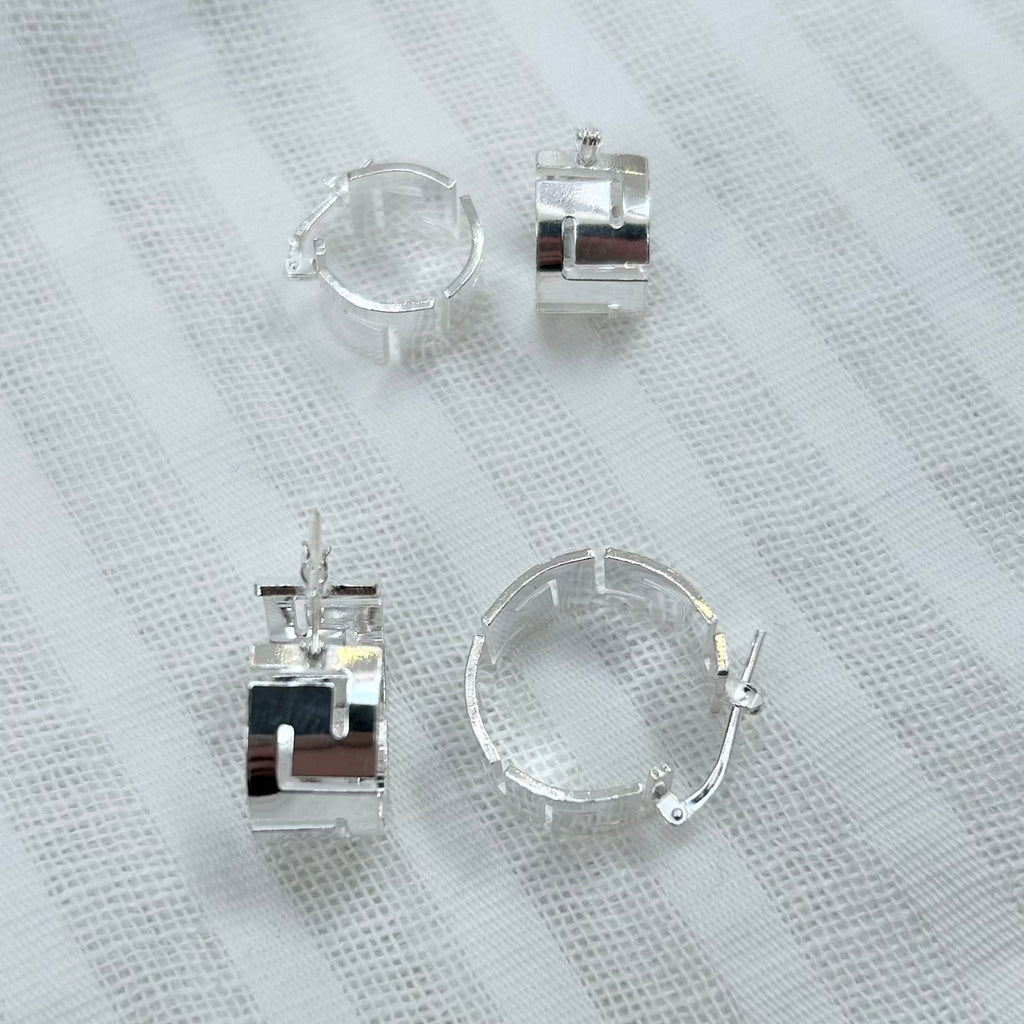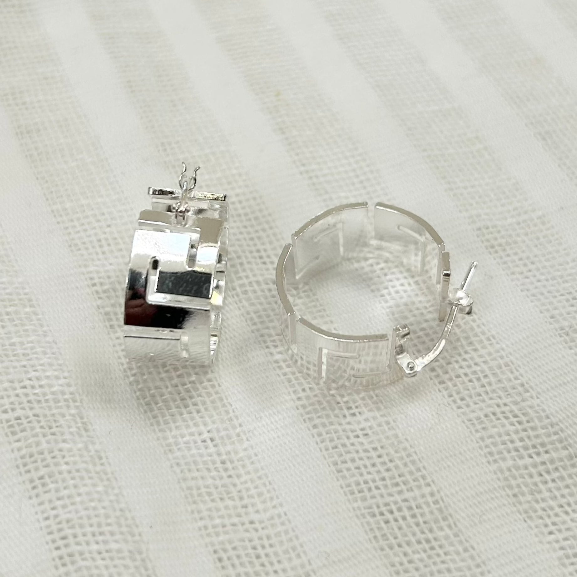 Medium sized Greek key pattern hoop earrings with a silver finish.