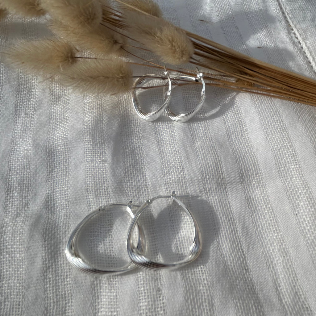 Twist design small hoop earrings with a silver textured finish in a triangular shape.