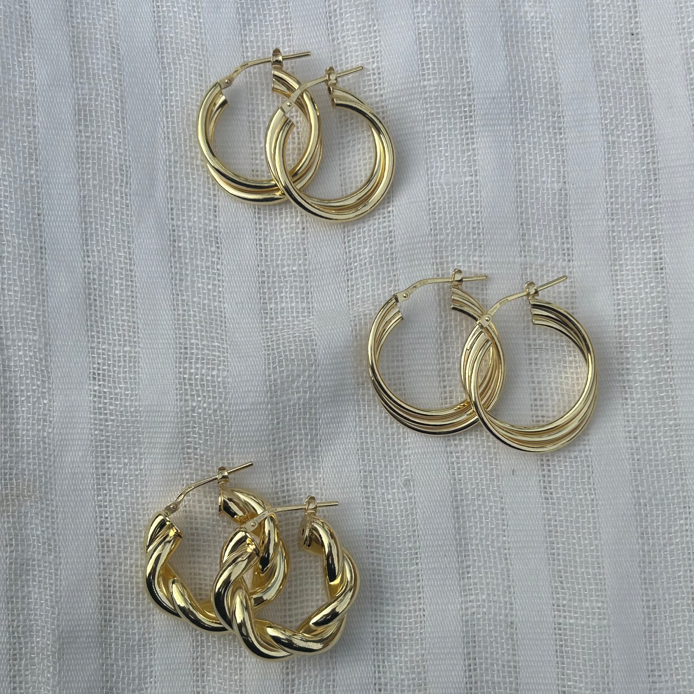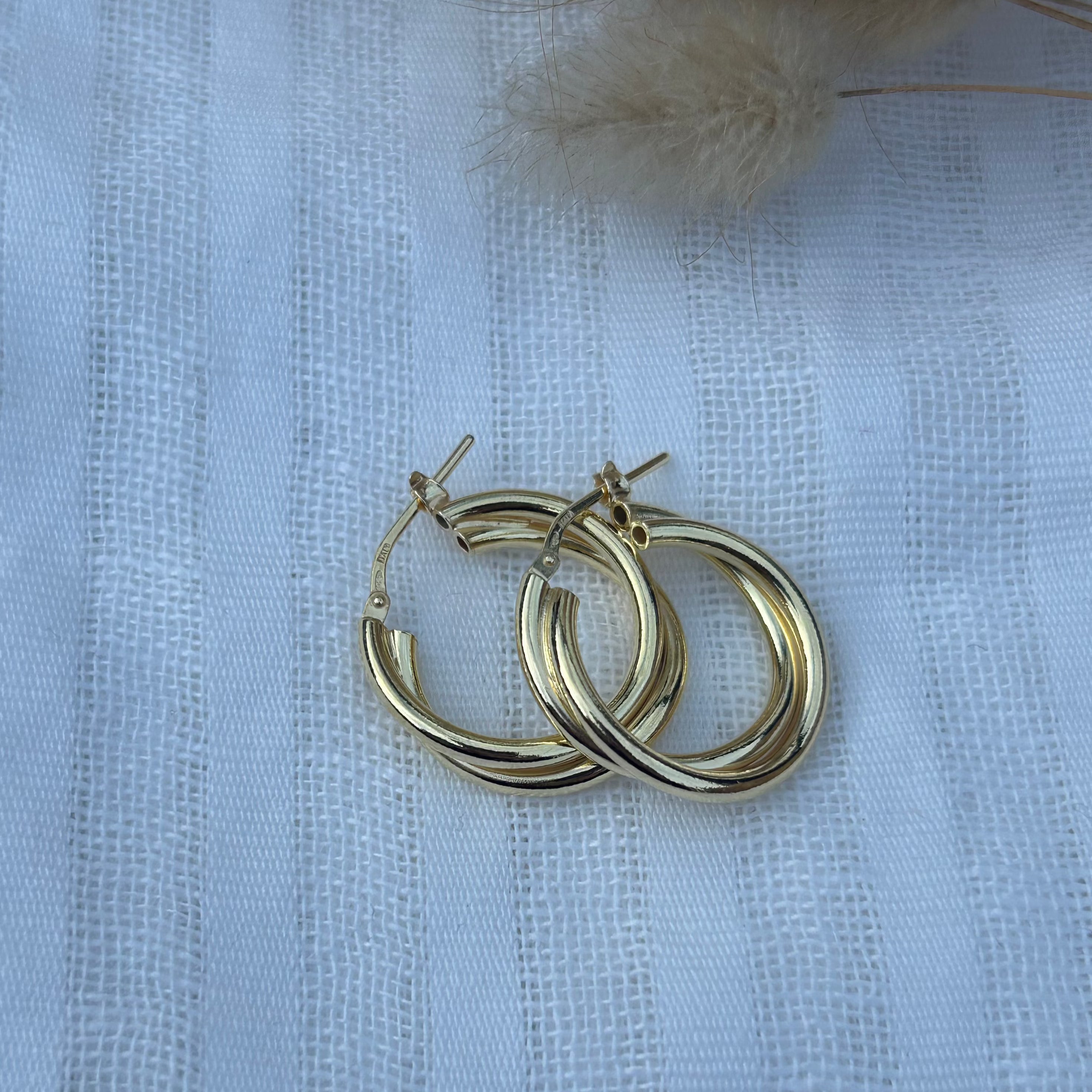 Three wire, mobius design hoop earrings with a gold plated finish.