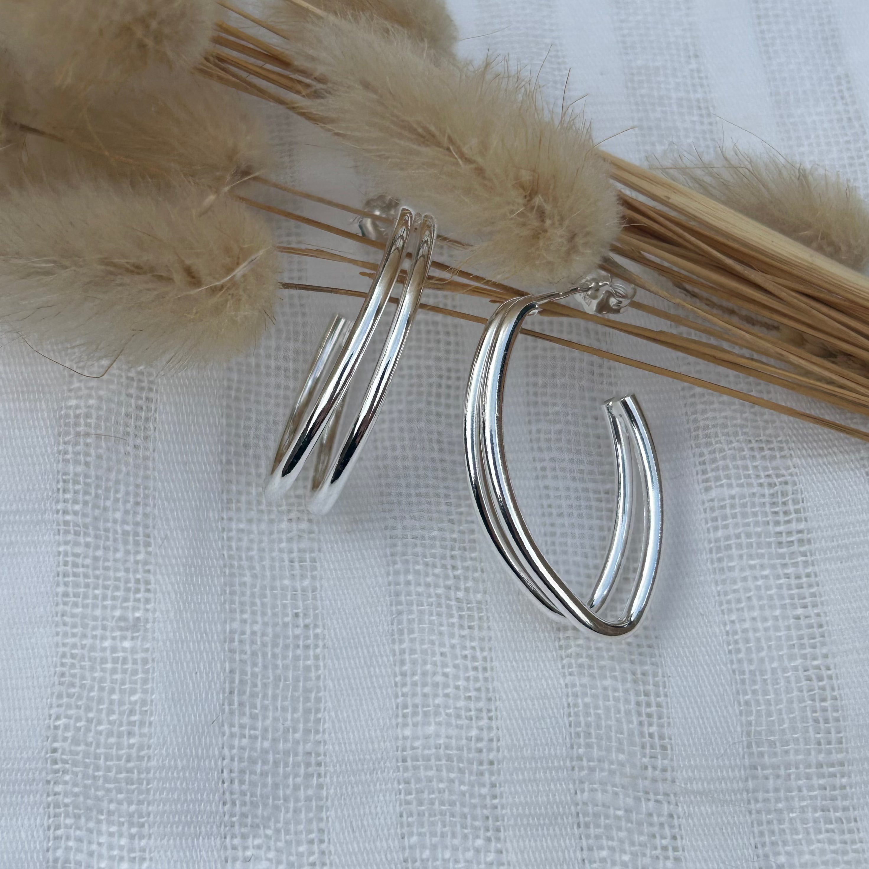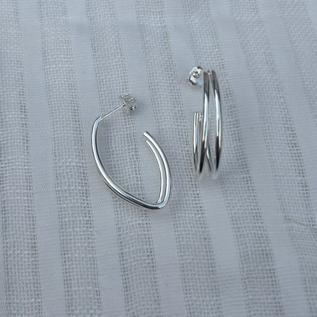 Two wire, half hoop design earrings with a silver finish and marquise like shape.