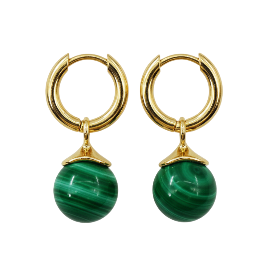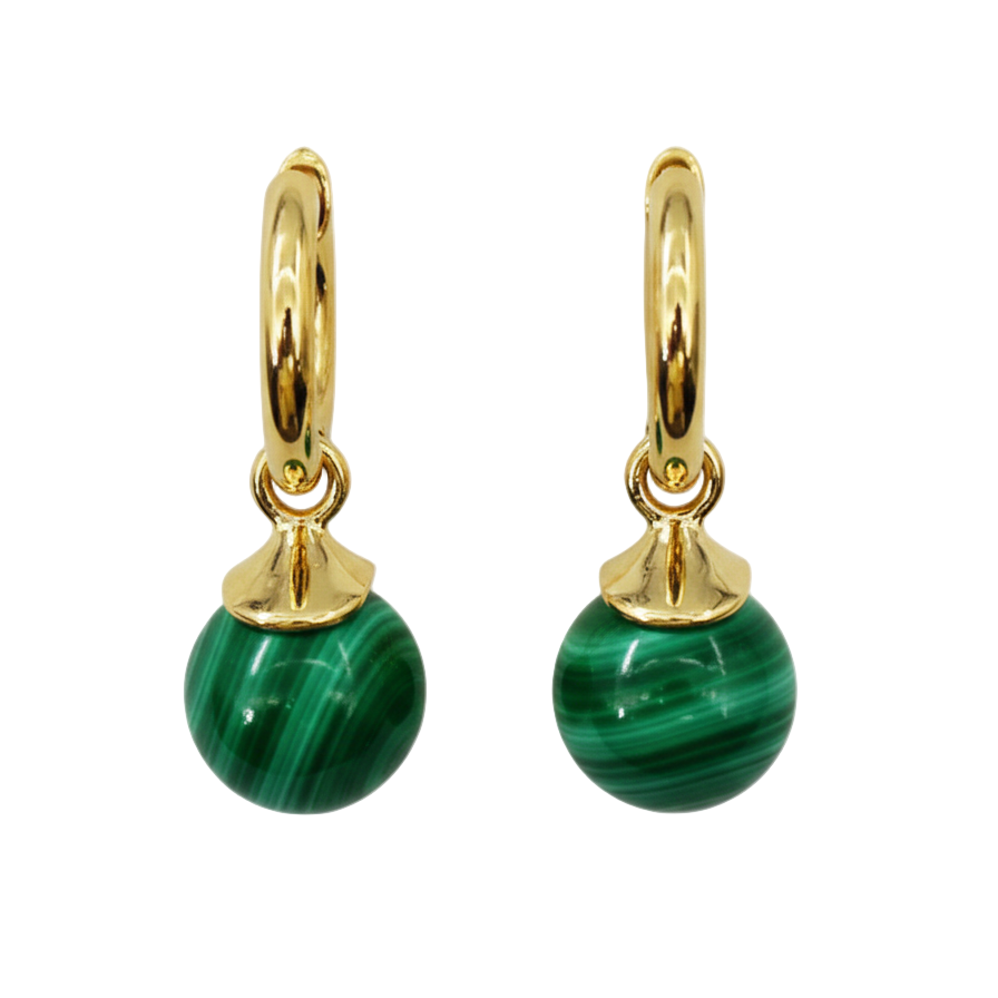 Statement silver huggies with a round malachite gemstone and gold plated finish.