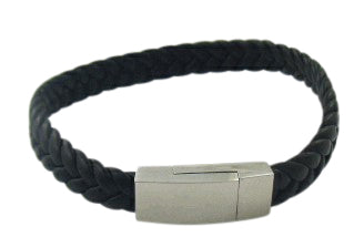 Men's braided black leather bracelet with simple polish finished silver magnetic clasp.