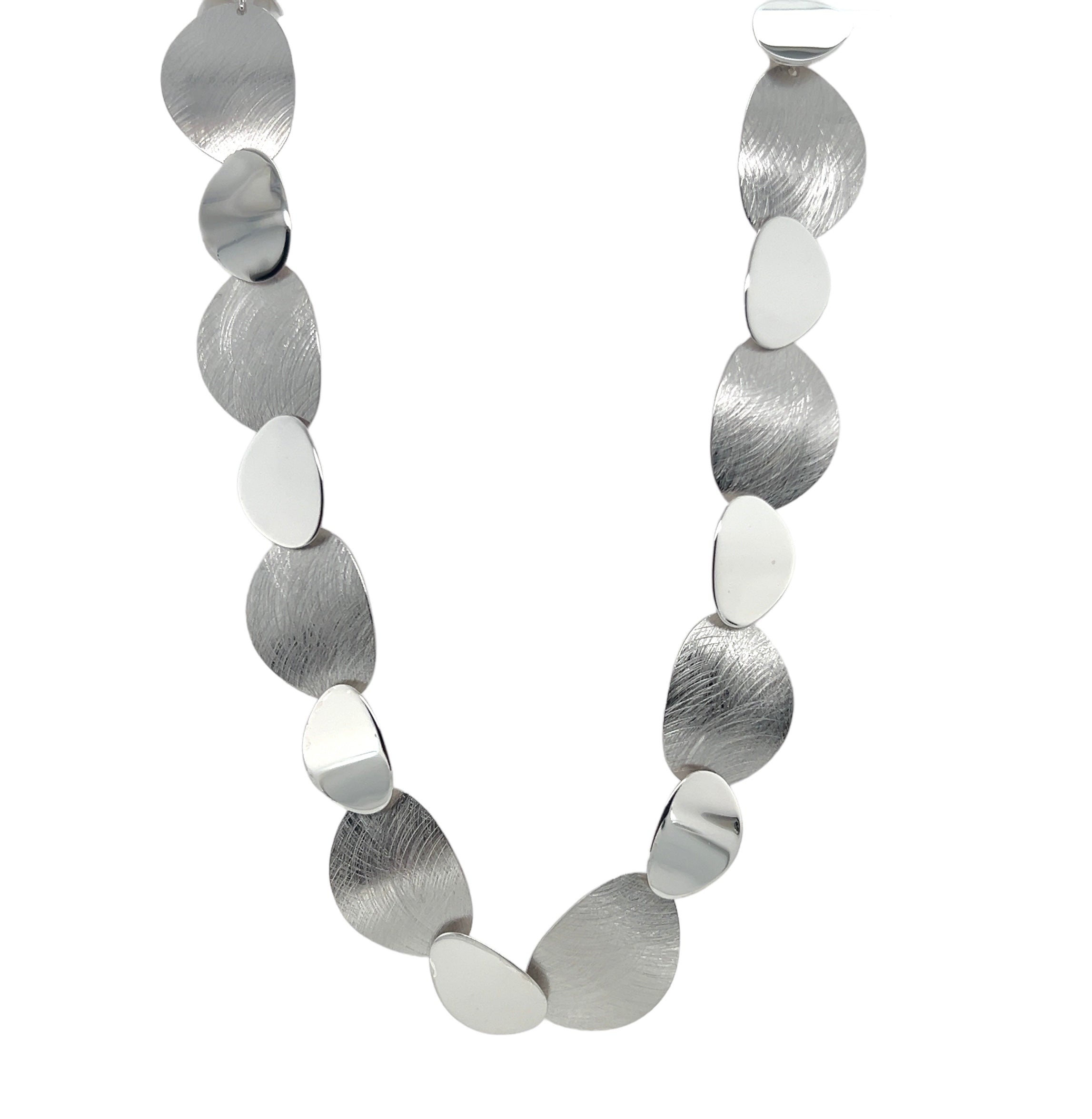 Multi element statement necklace with a scratch and polished alternate finish.