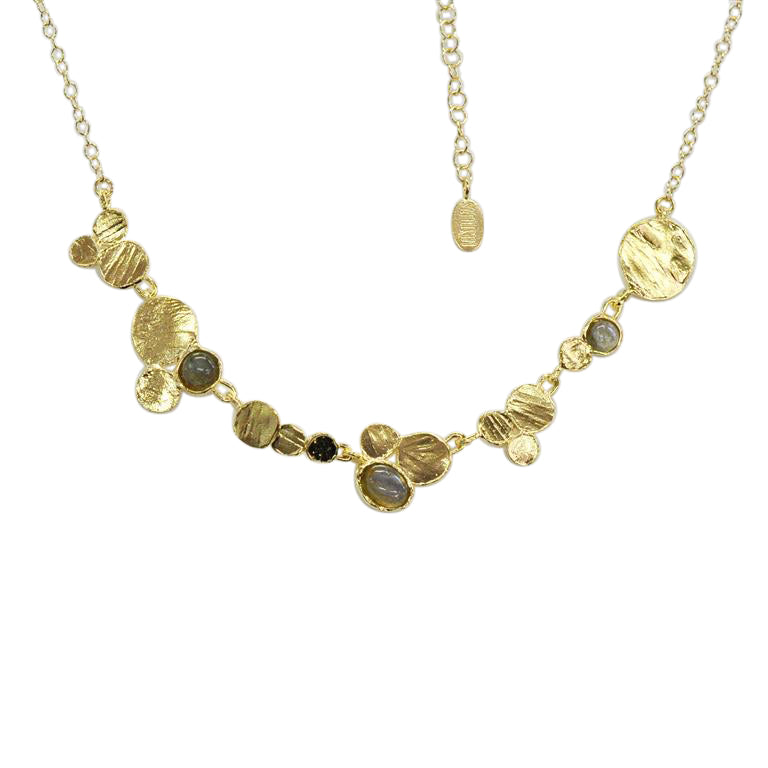 Multi circle element gold plated necklace with round cabuchon labradorite stones. Part of the Saphirim collection.