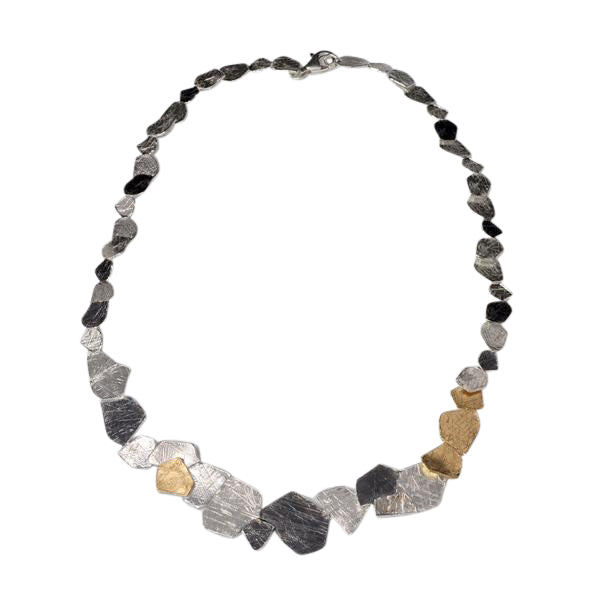 Three colour multi element, textured statement necklace with sterling silver, gold plated and oxidised detail. Part of the Saphirim range.
