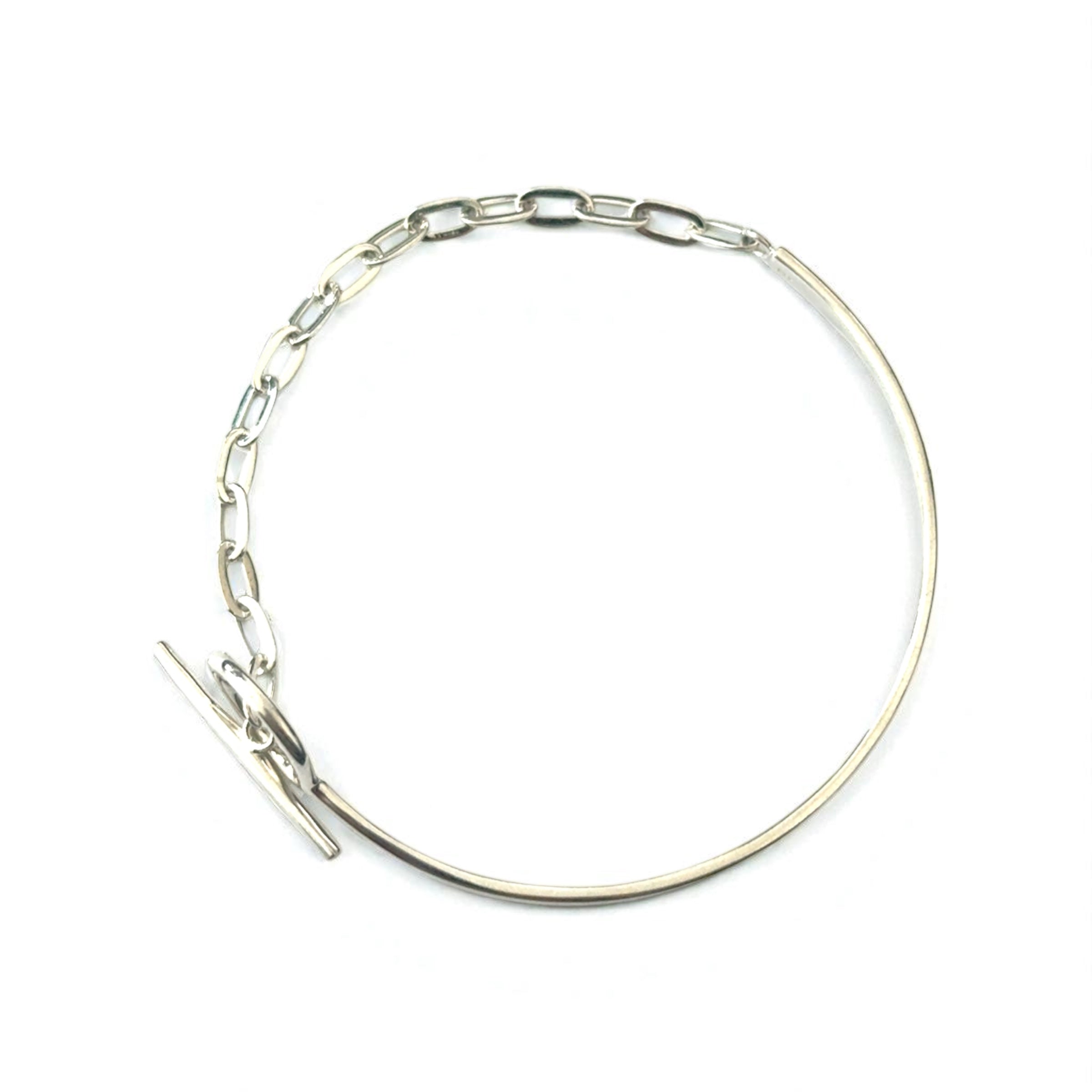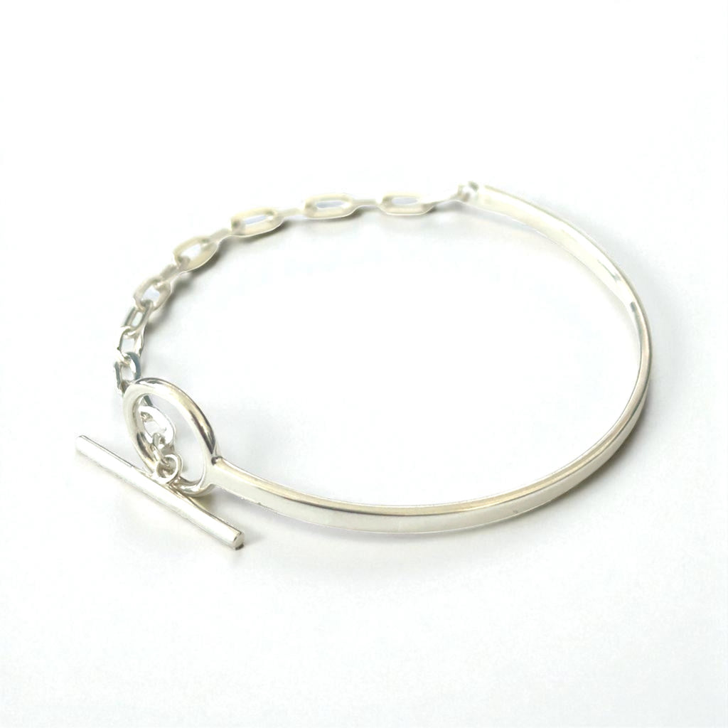 T-bar clasp half cuff half chain style silver bracelet with polish finish.