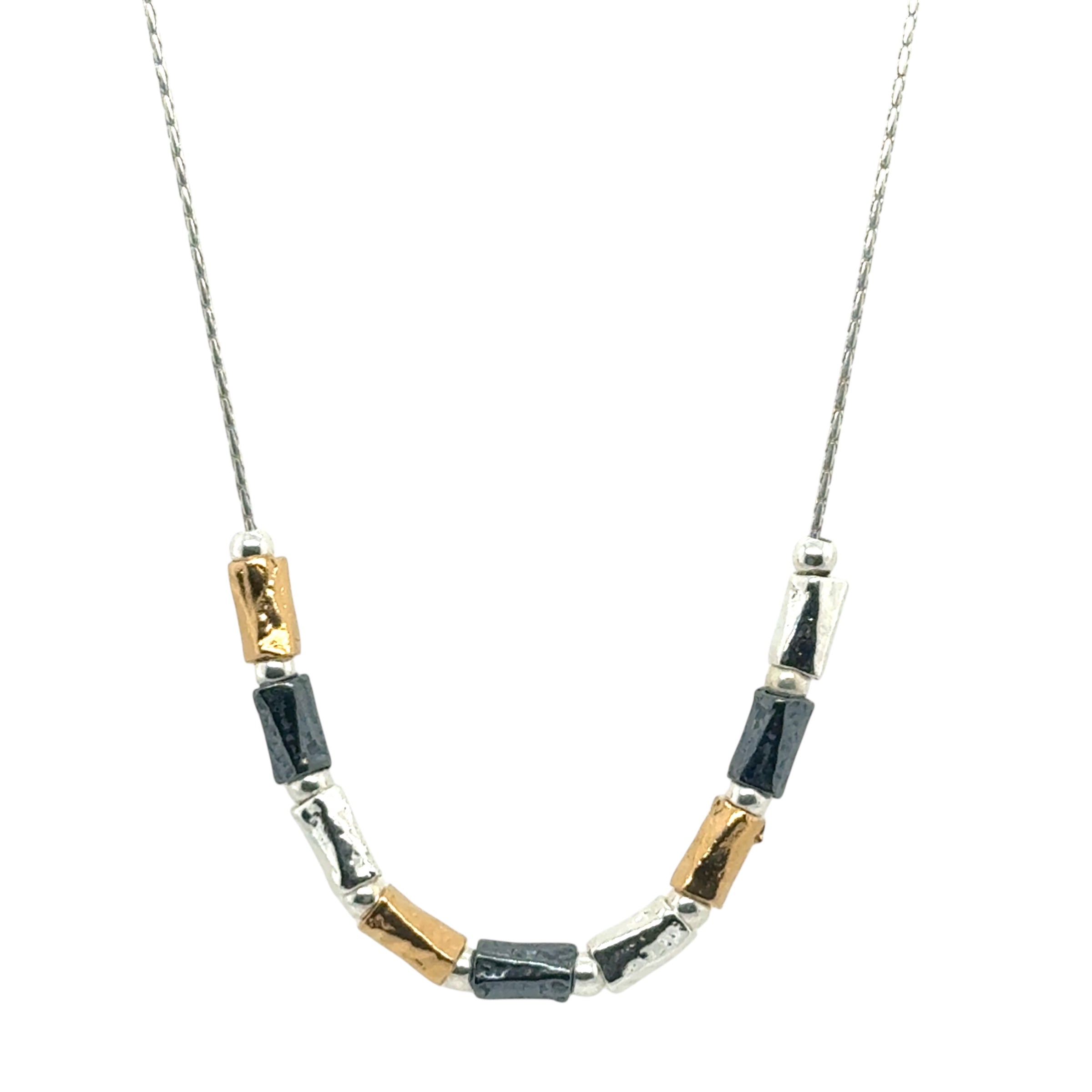 Three colour, organic tube necklace on chain with silver, gold plated and oxidised finish. Part of the Saphirim collection.