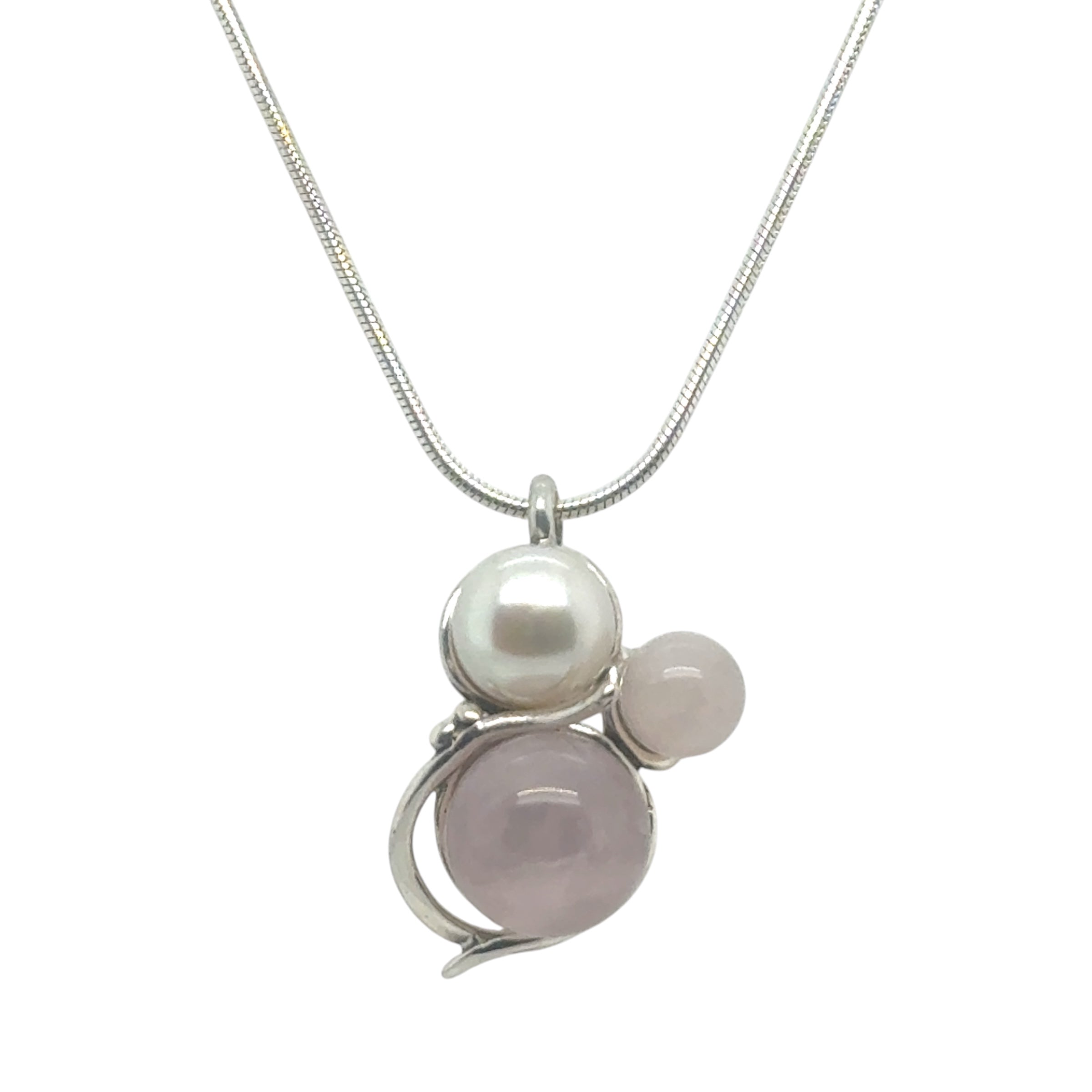 Antique design rose quartz and pearl on snake silver chain. It is part of the Hagit Designs collection.