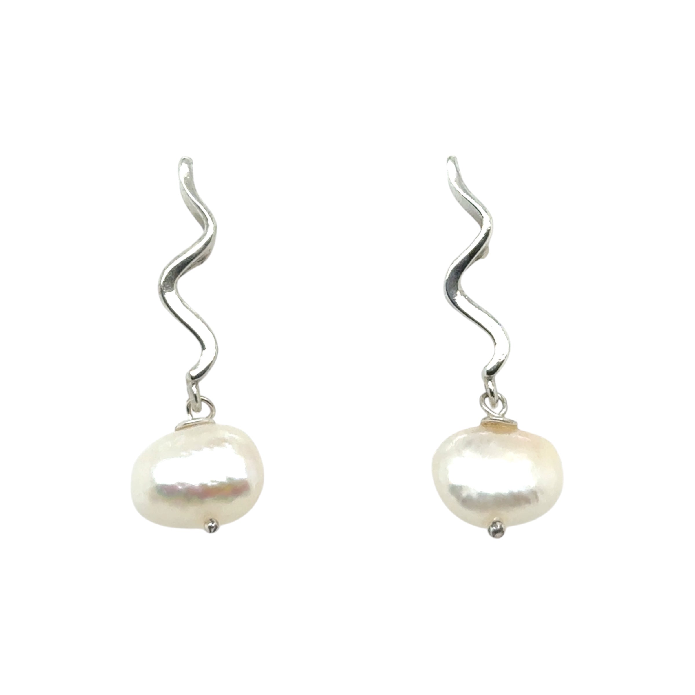 Baroque white pearl with link detail silver drop earrings. It is part of the Hagit Designs collection.