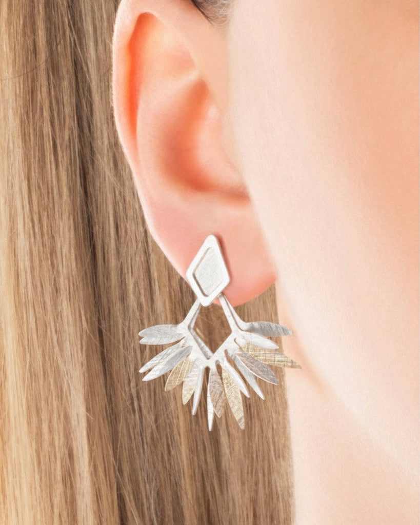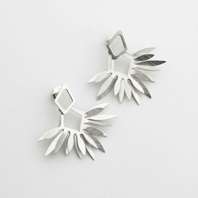 Fan design silver drop earrings with brushed matt detail.