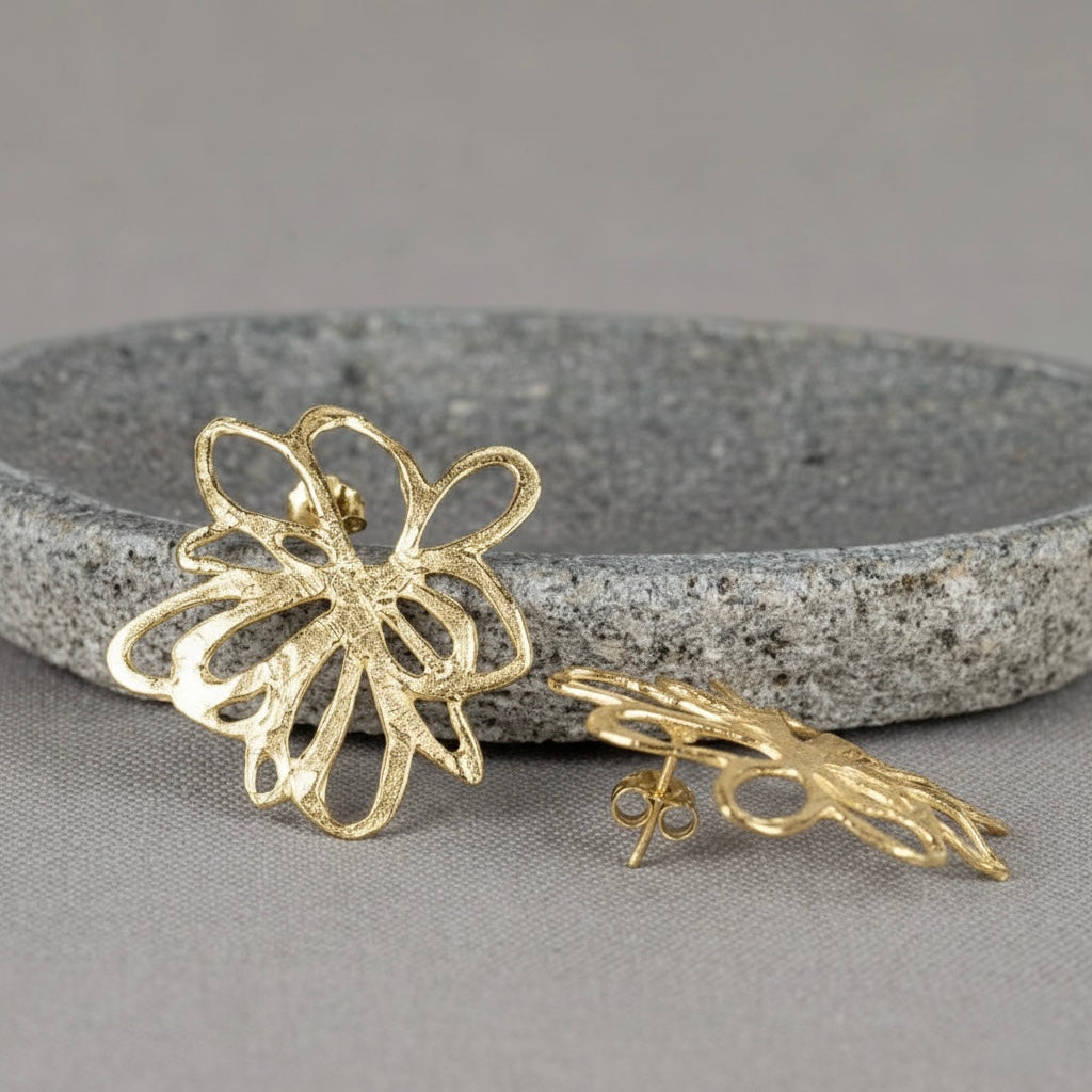 Statement organic design flower shape gold plated silver stud earrings. Part of the Saphirim collection.