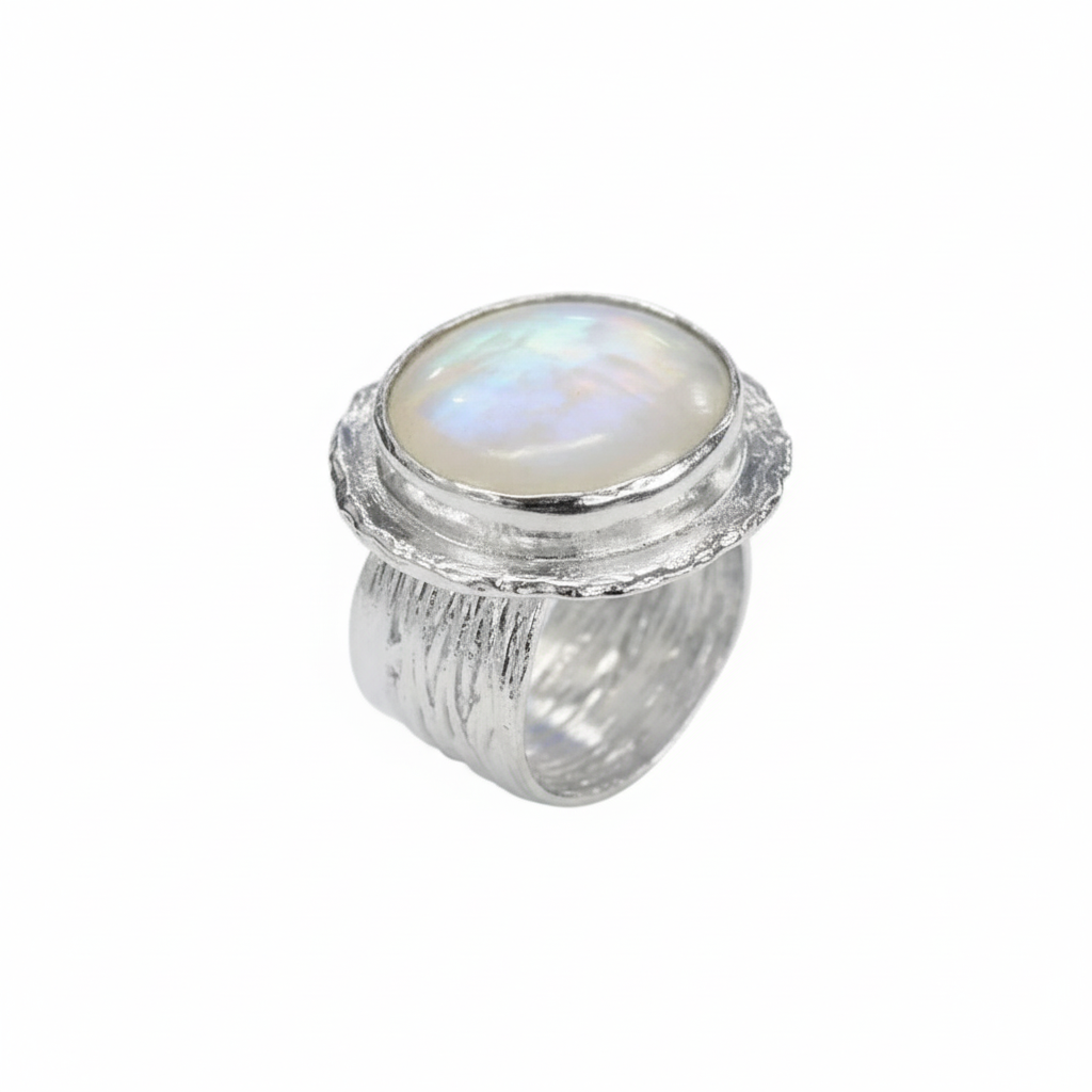 Organic statement silver ring with large pearl and organic textured band. Part of the Saphirim collection.