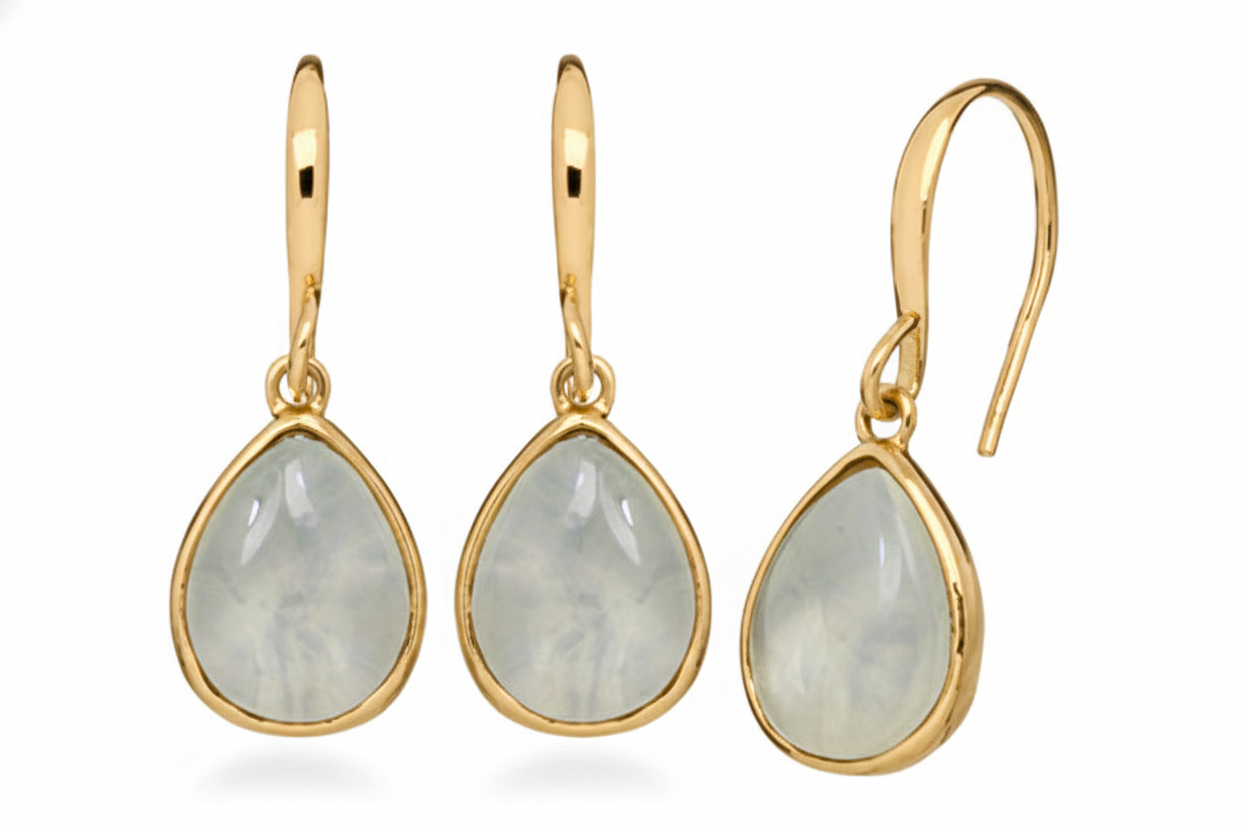 Teardrop cabuchon moonstone gold plated silver drop earrings.