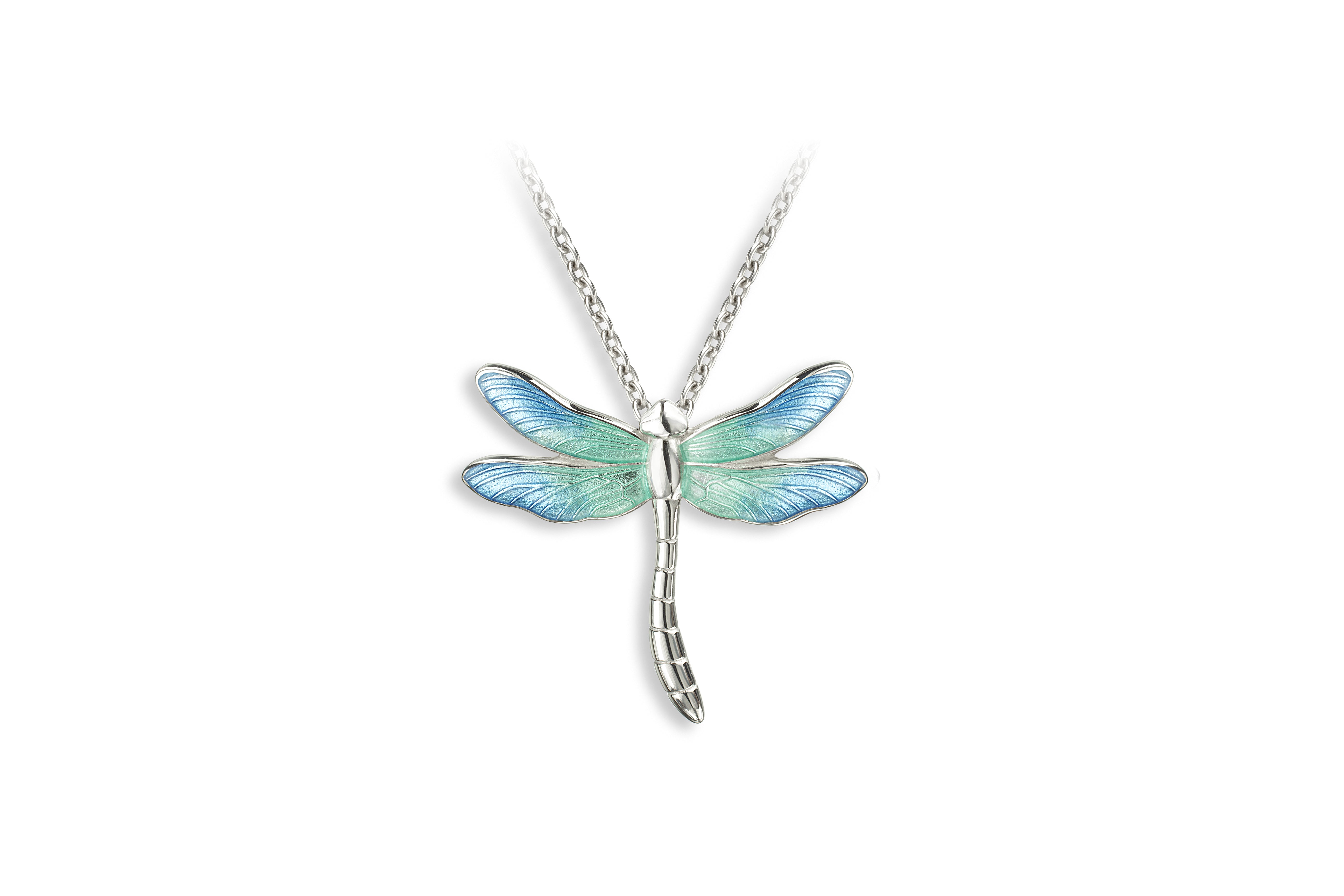 Beautiful dragonfly pendant necklace with blue and green enamel.