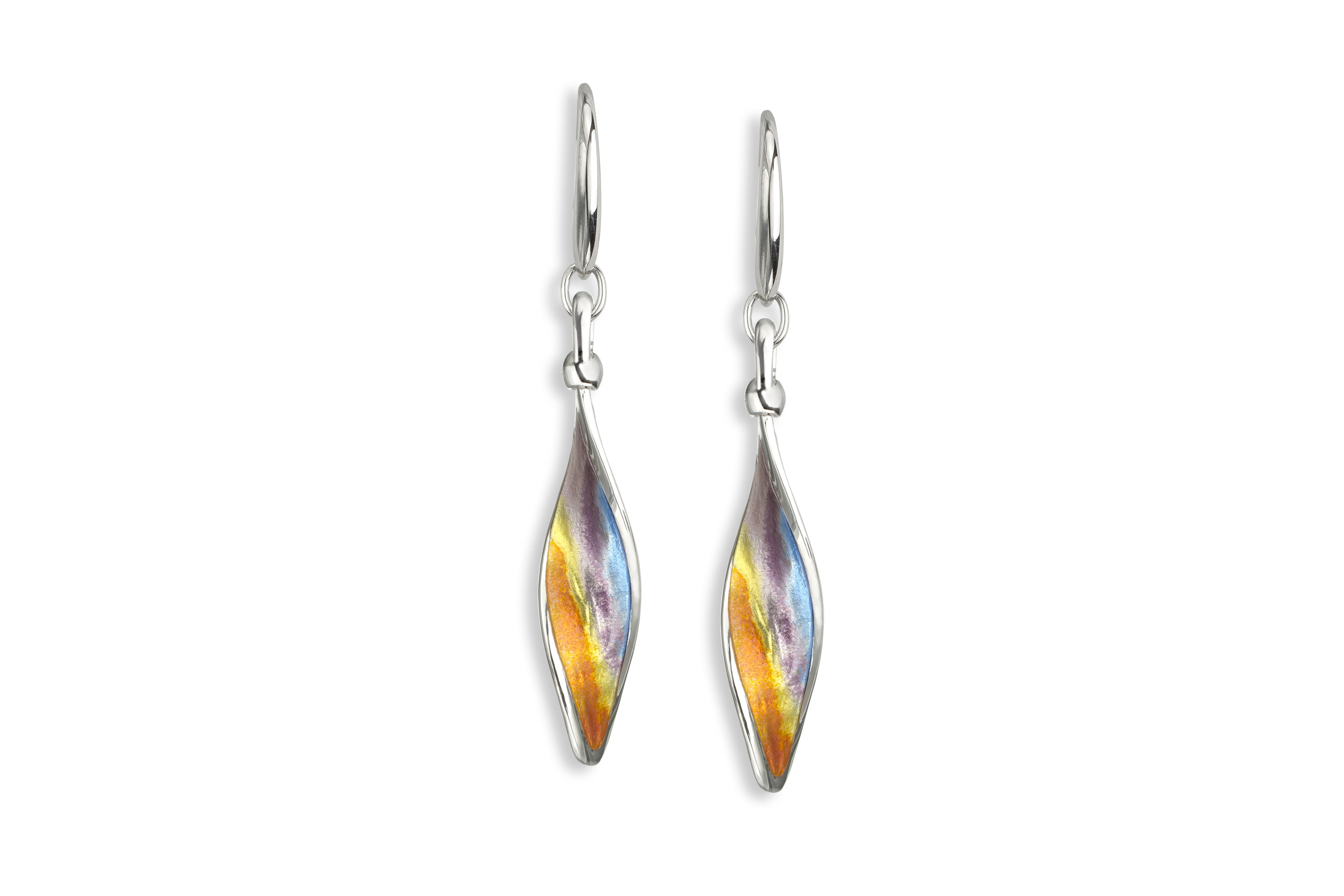 Sunset aurora drop earrings with orange, yellow and blue enamel.