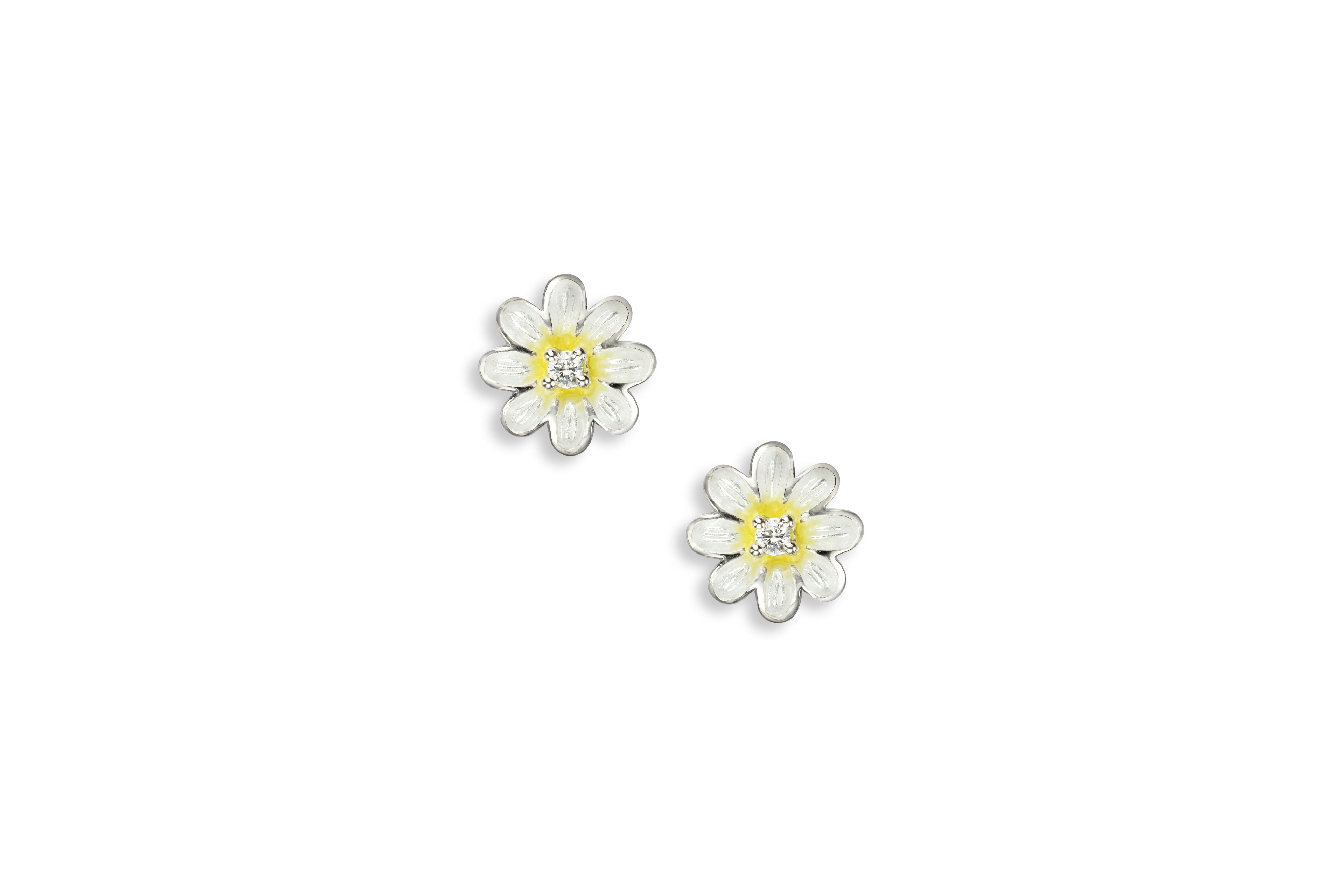 Beautiful white enamel Daisy stud earrings with white sapphires.