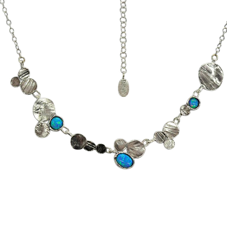 Multi circle element oxidised necklace with round cabuchon opalite stones. Part of the Saphirim collection.