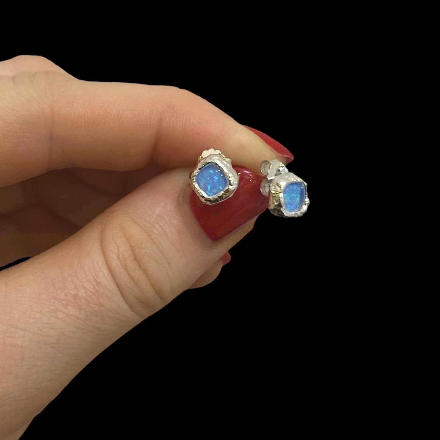 Square opalite stud earrings set in simple silver setting. Part of the Saphirim collection.