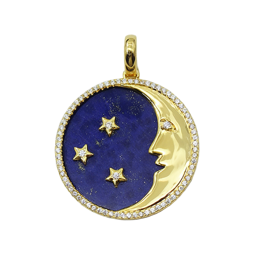 Statement lapis moon pendant with CZ gemstones and a gold plated finish. This pendant features a clip bail.