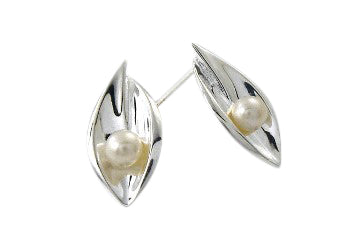 Curved leaf style silver stud earrings with freshwater pearl and a polished finish.