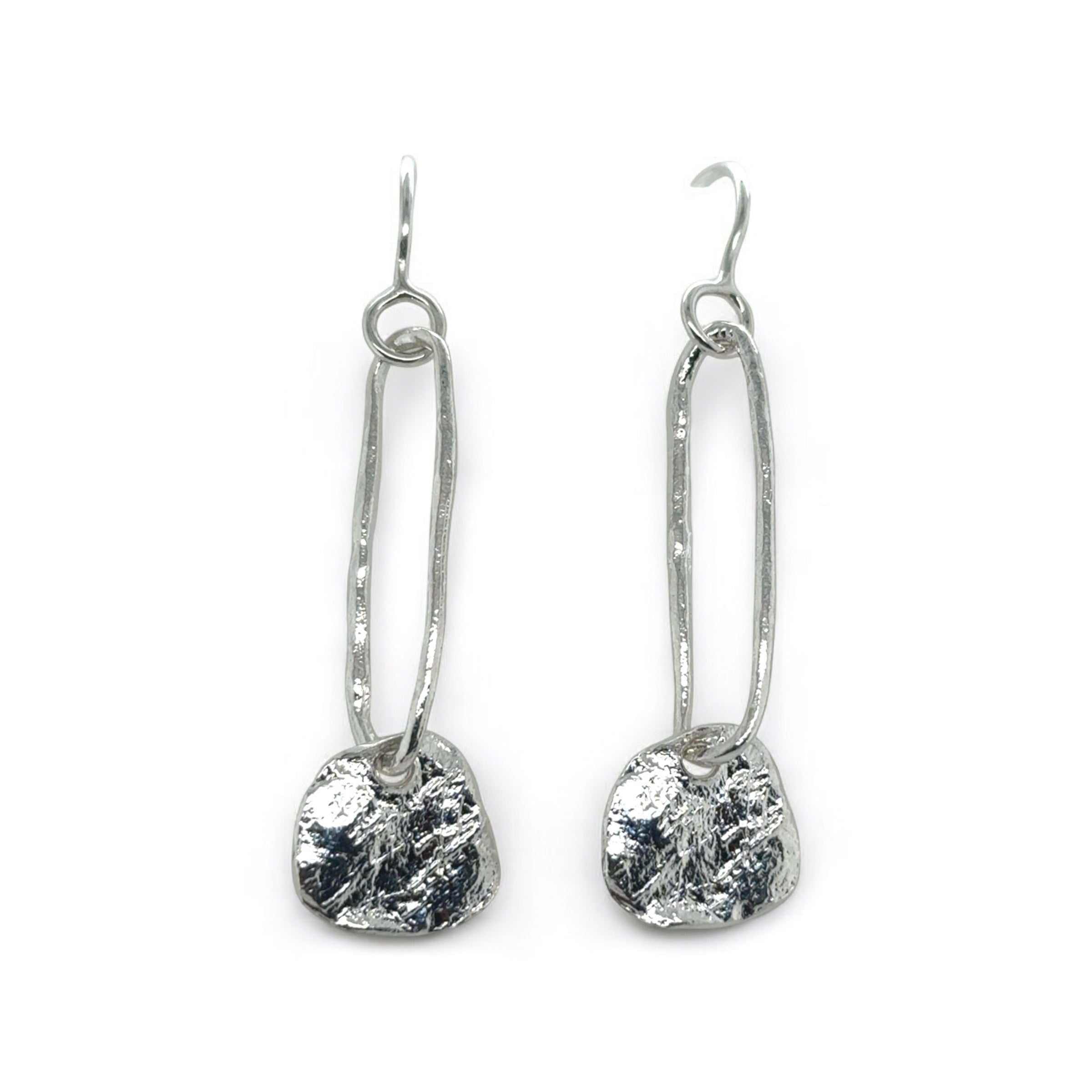 Articulated silver drop earrings with dangly silver disks. Part of the Saphirim collection.