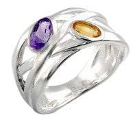 Beautiful wrap around ring with a polish and matt finish, featuring oval Amethyst and Citrine stones.
